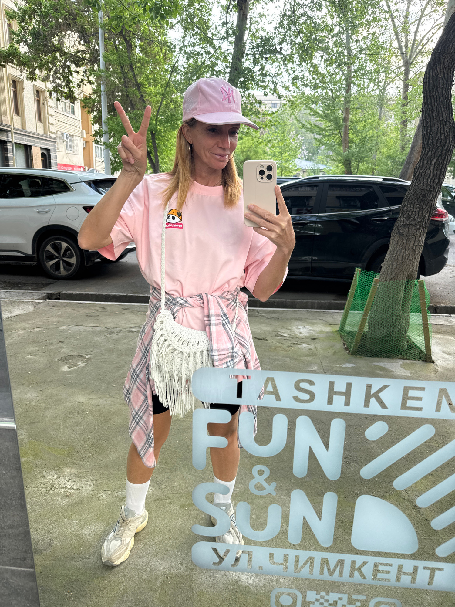 A woman in a pink outfit stands in front of a glass window, taking a selfie with her smartphone. She wears a pink T-shirt, a pink plaid skirt, white socks, and sneakers. She is also wearing a pink bas…read more
