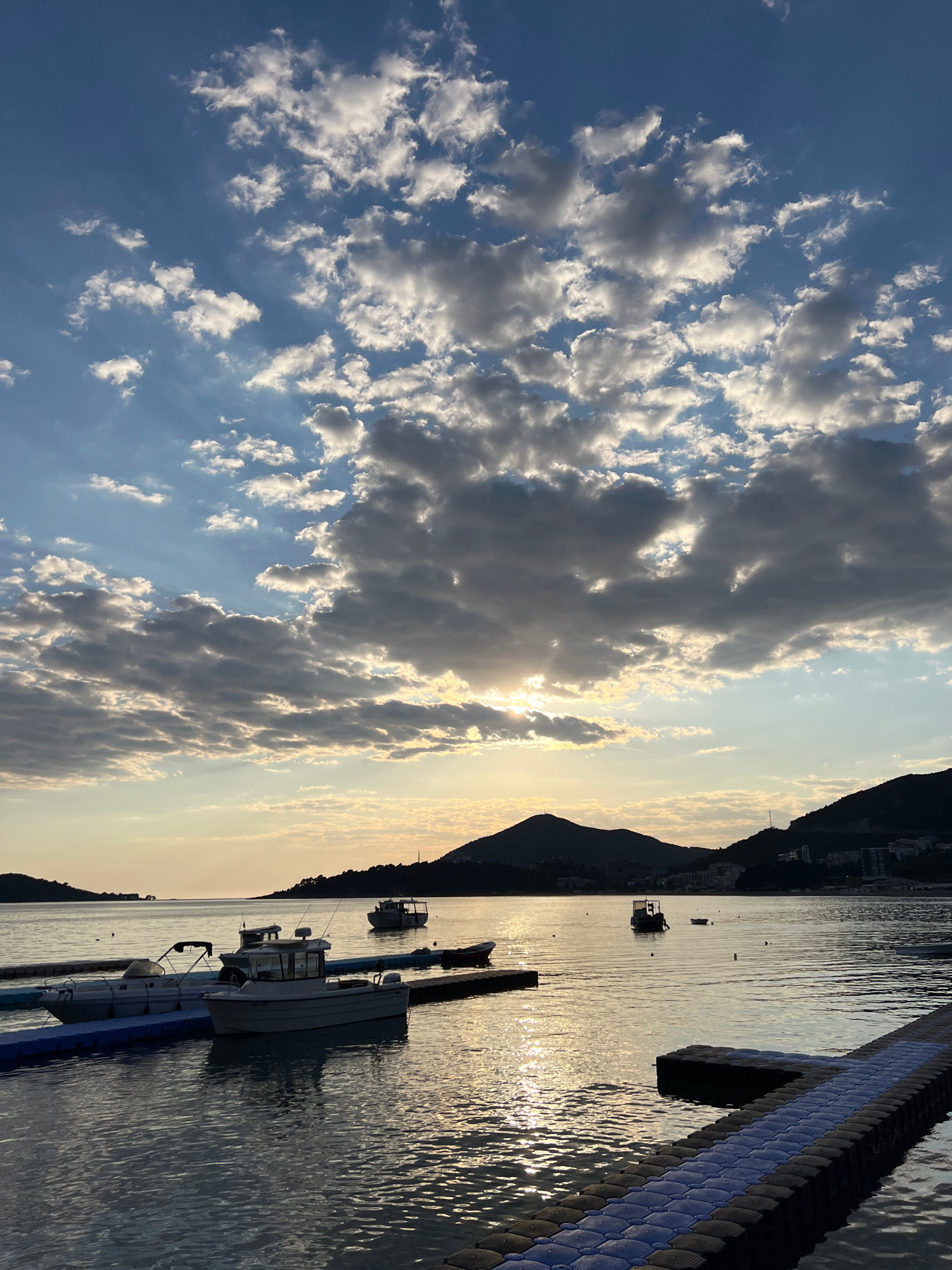 The image captures a late afternoon or early evening scene in Budva, Montenegro, with a focus on the bay area. The right side of the frame shows part of a floating dock made of blue and black material…read more