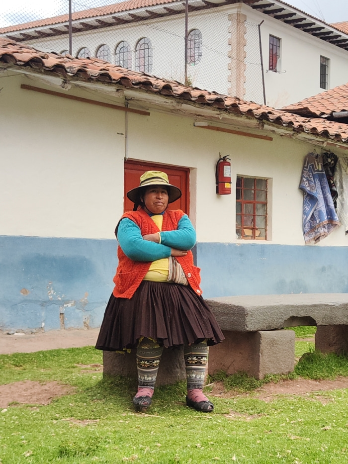 A woman wearing traditional Andean clothing sits on a stone bench outside a building. She has on a wide-brimmed hat, a blue top, a yellow shirt, and a red knitted vest. Her skirt is brown, and she wea…read more