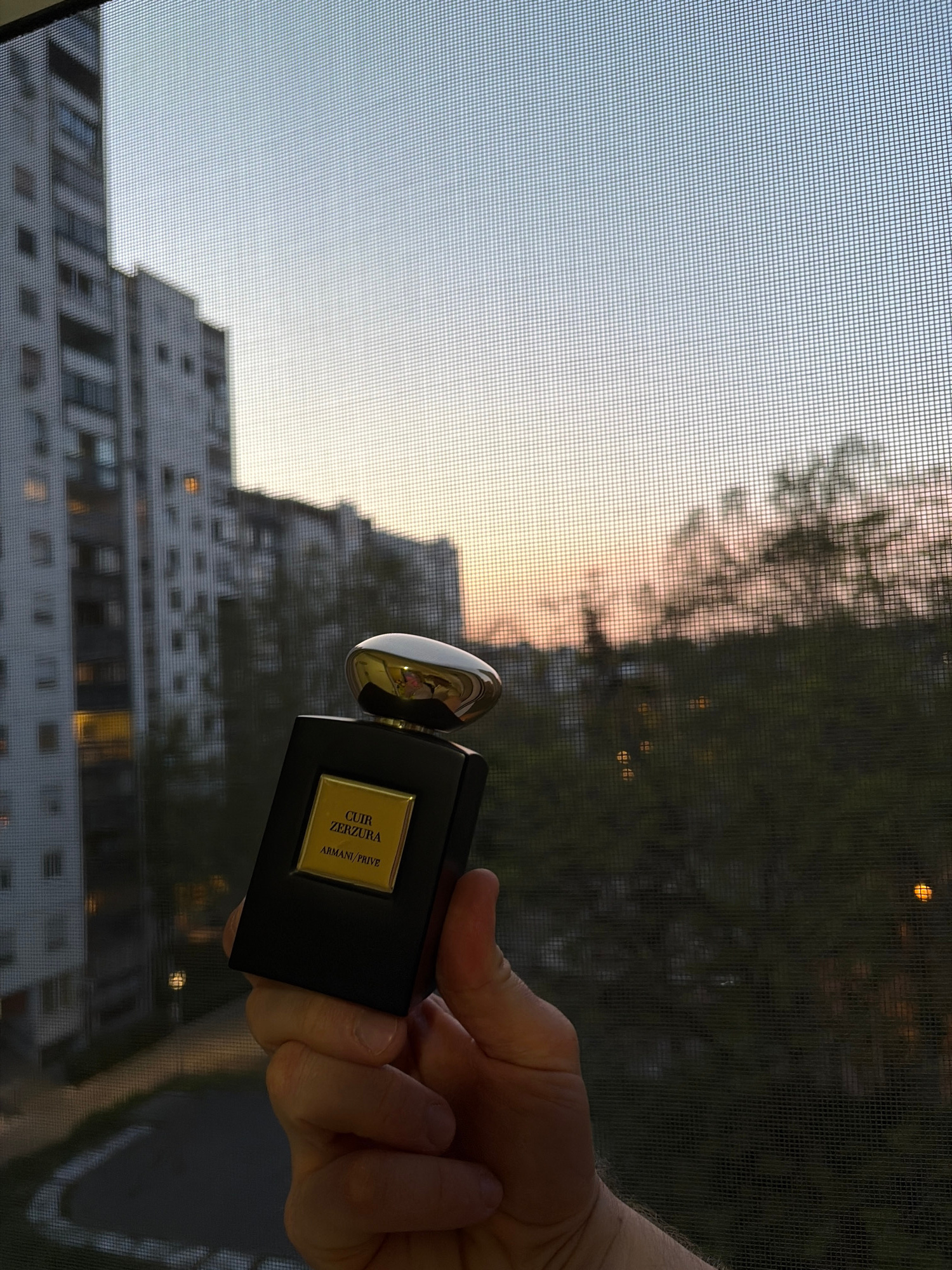 The image presents a close-up, slightly tilted view through a window screen, revealing an urban landscape at either sunrise or sunset. A person's hand, entering the frame from the right, holds a black…read more