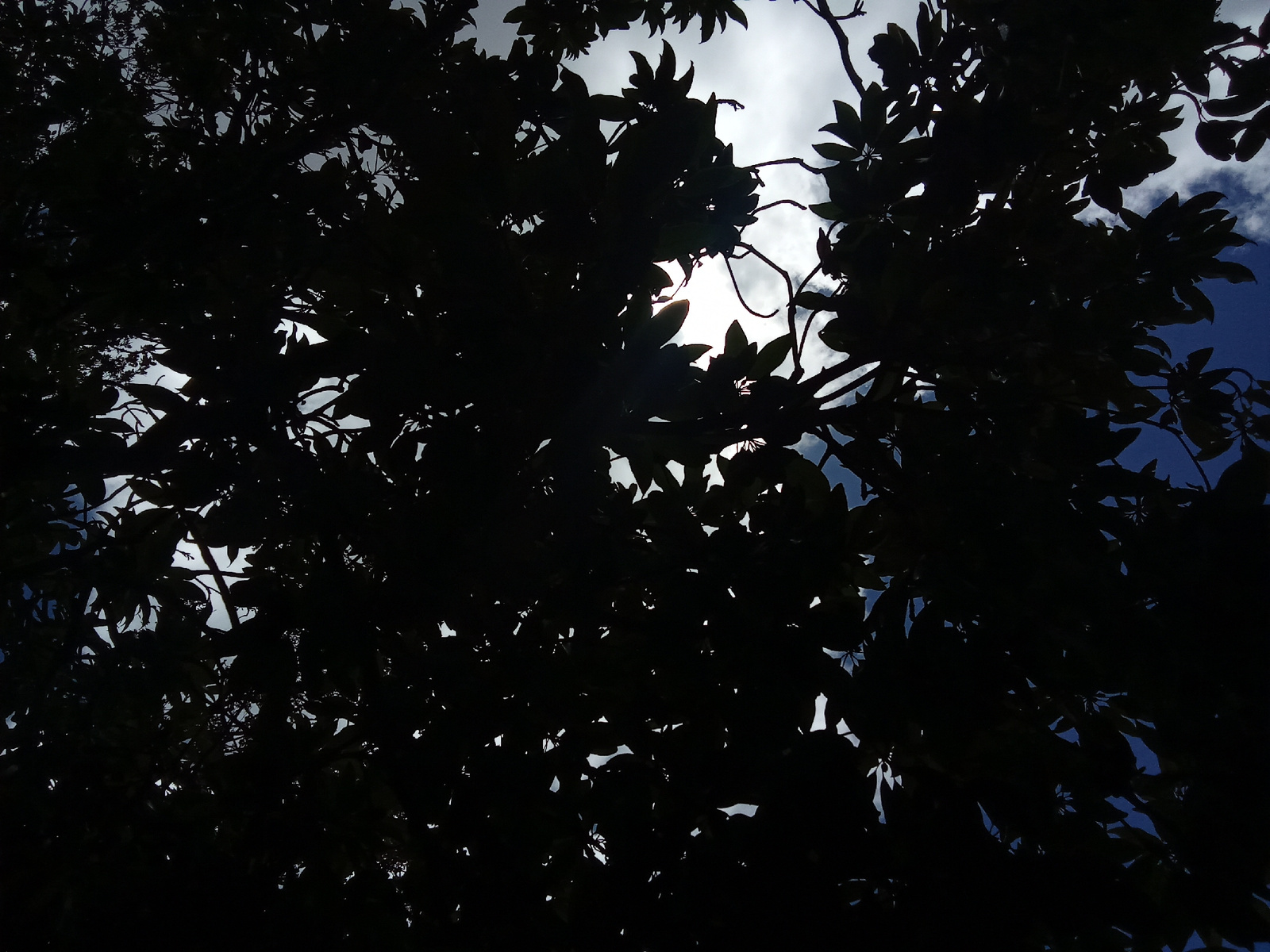 The image shows a low-angle view of dense foliage silhouetted against a bright sky. The leaves are dark and appear to belong to a tree. The sky visible through the gaps in the foliage is a mix of ligh…read more