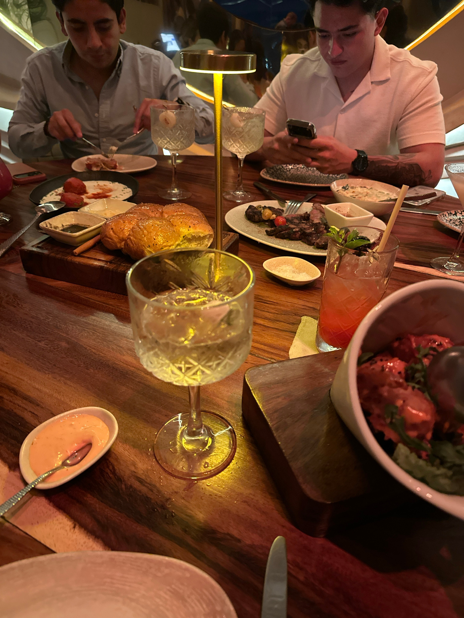 The image shows a table setting at a restaurant in Acapulco, Mexico. The table is made of dark wood and has several plates of food and drinks on it. There are two men at the table. One man is wearing…read more