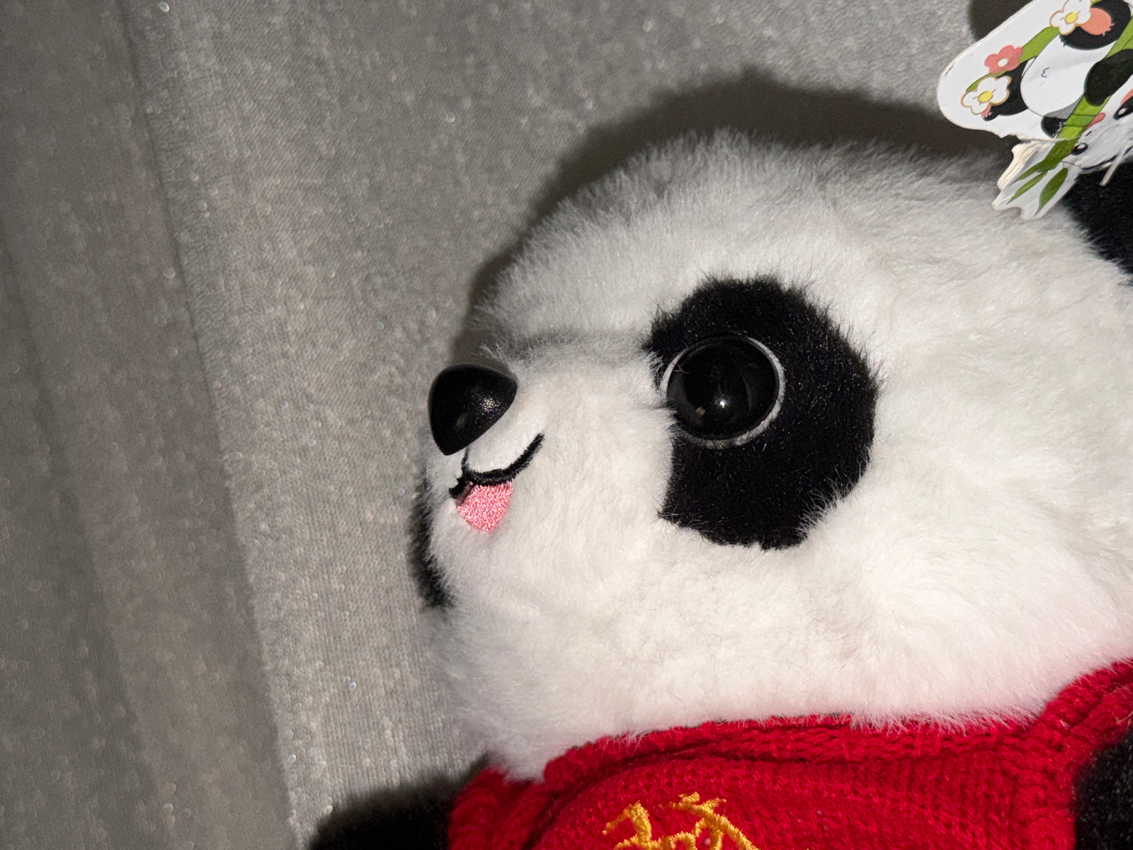 A close-up photograph shows a plush panda toy. The panda has black and white fur, with black patches around its eyes. It has a small pink embroidered detail representing its mouth. The panda is wearin…read more