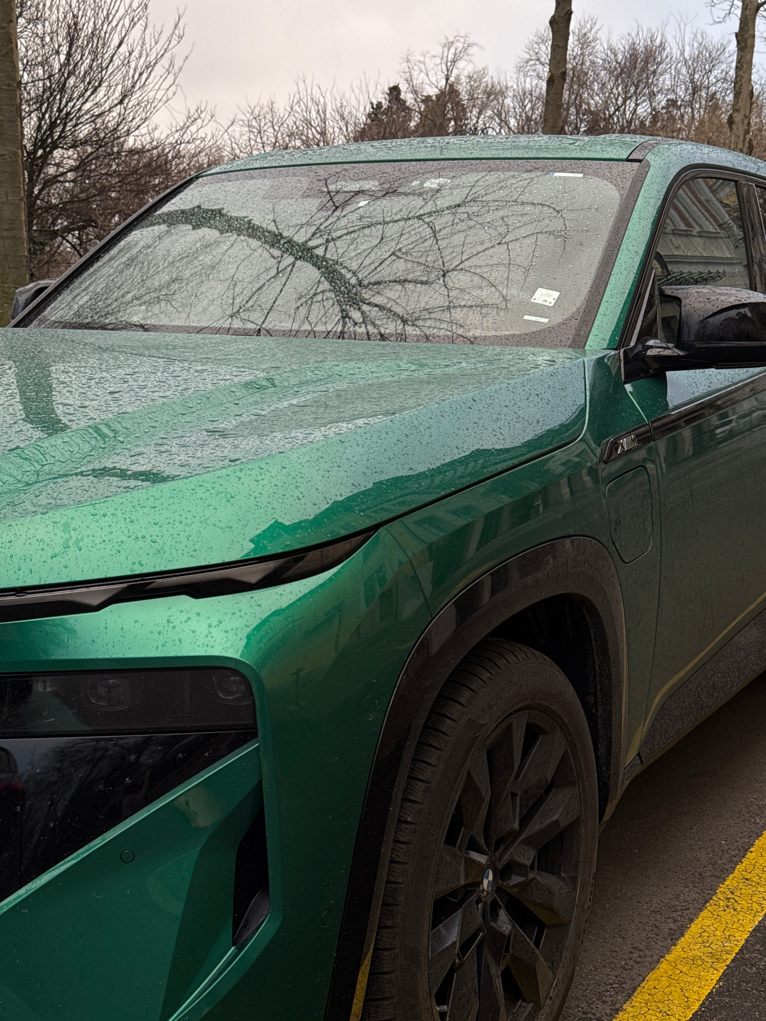 A green BMW vehicle is parked on a street with yellow curb markings. The vehicle is wet, likely from rain, with droplets visible on the windshield and body. Bare trees are reflected in the windshield.…read more