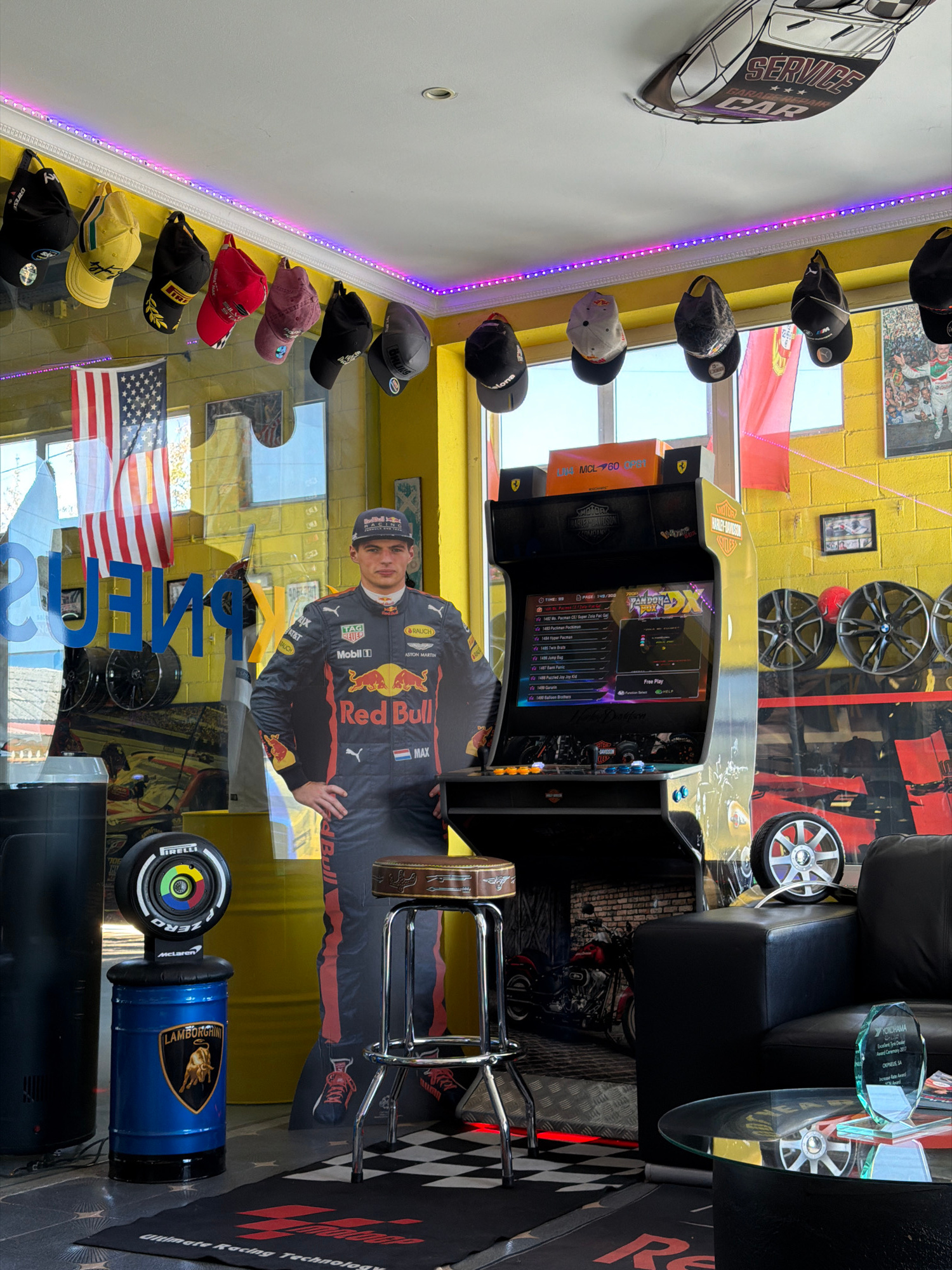 The image shows an elaborately decorated room or space, likely a themed room or showroom, with a strong automotive racing theme. The dominant color scheme is yellow, with splashes of black, red, and b…read more
