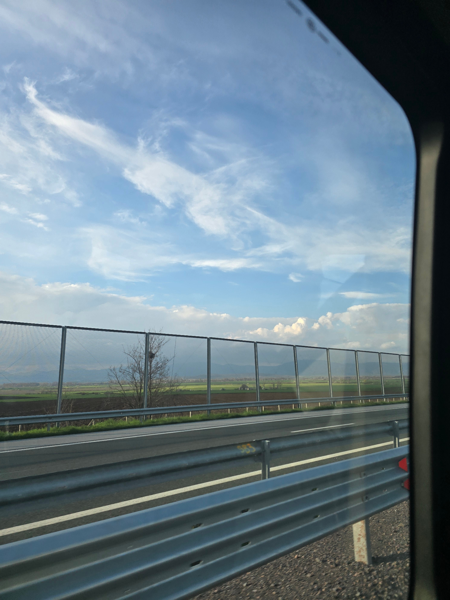 The image appears to be taken from inside a vehicle, looking out a side window. A bright, blue sky with wispy white clouds is visible. A sound barrier, constructed of vertical supports with translucen…read more