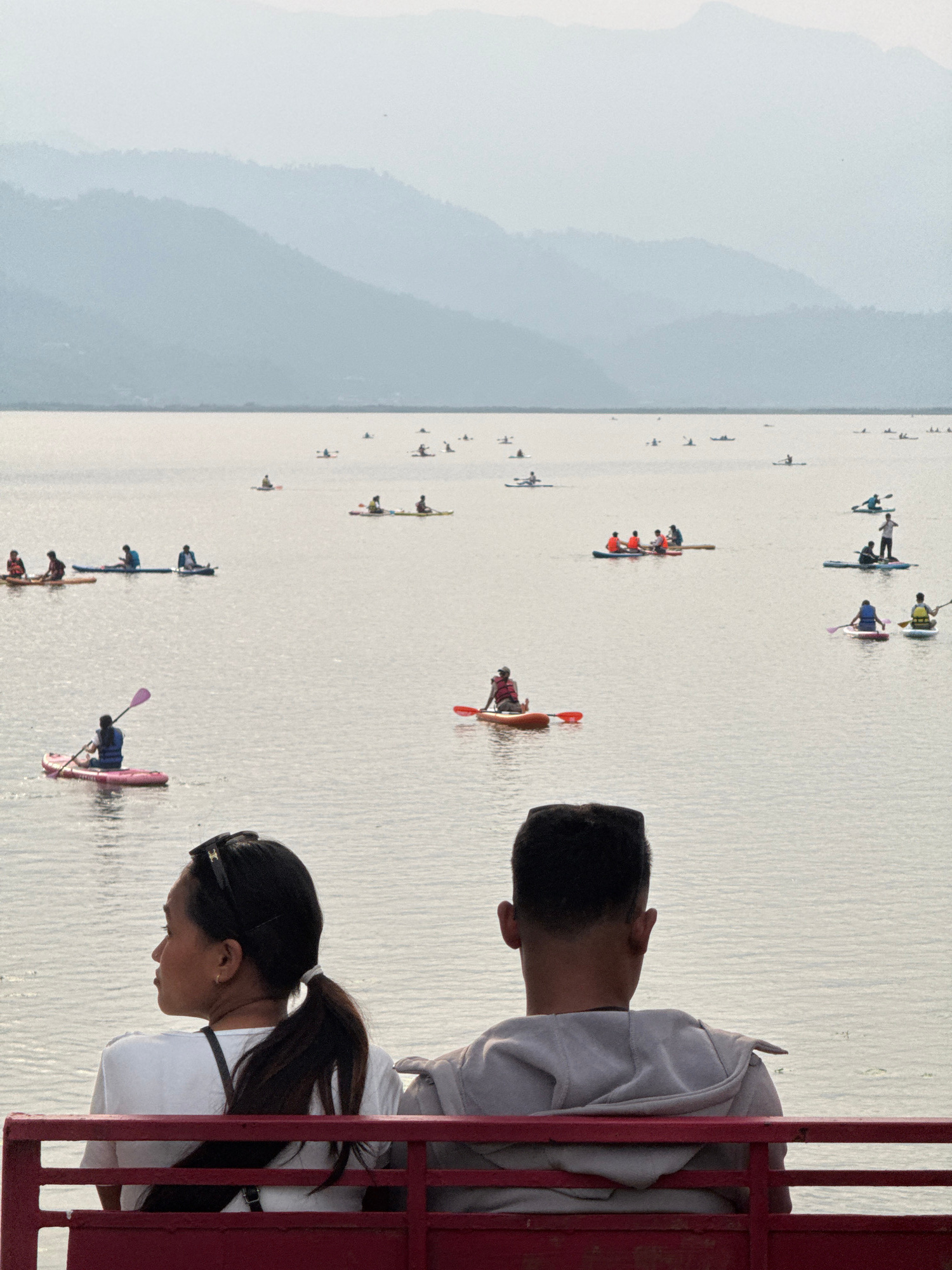 The image shows a scene in Pokhara, Nepal, overlooking Phewa Lake. A man and a woman stand in the foreground, seen from behind, observing the lake from what appears to be a red railing structure. Theβ¦read more