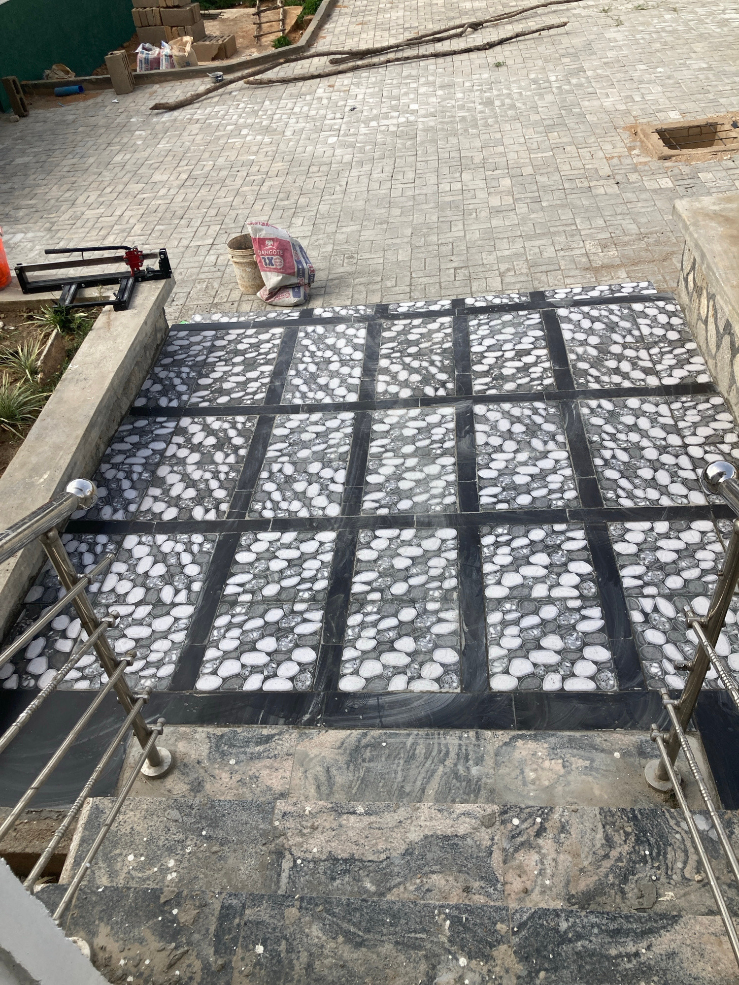 The image shows a view from above, possibly a balcony or elevated position, of an outdoor area in Jos, Nigeria. The ground is covered with various types of paving. One section features a black and whi…read more