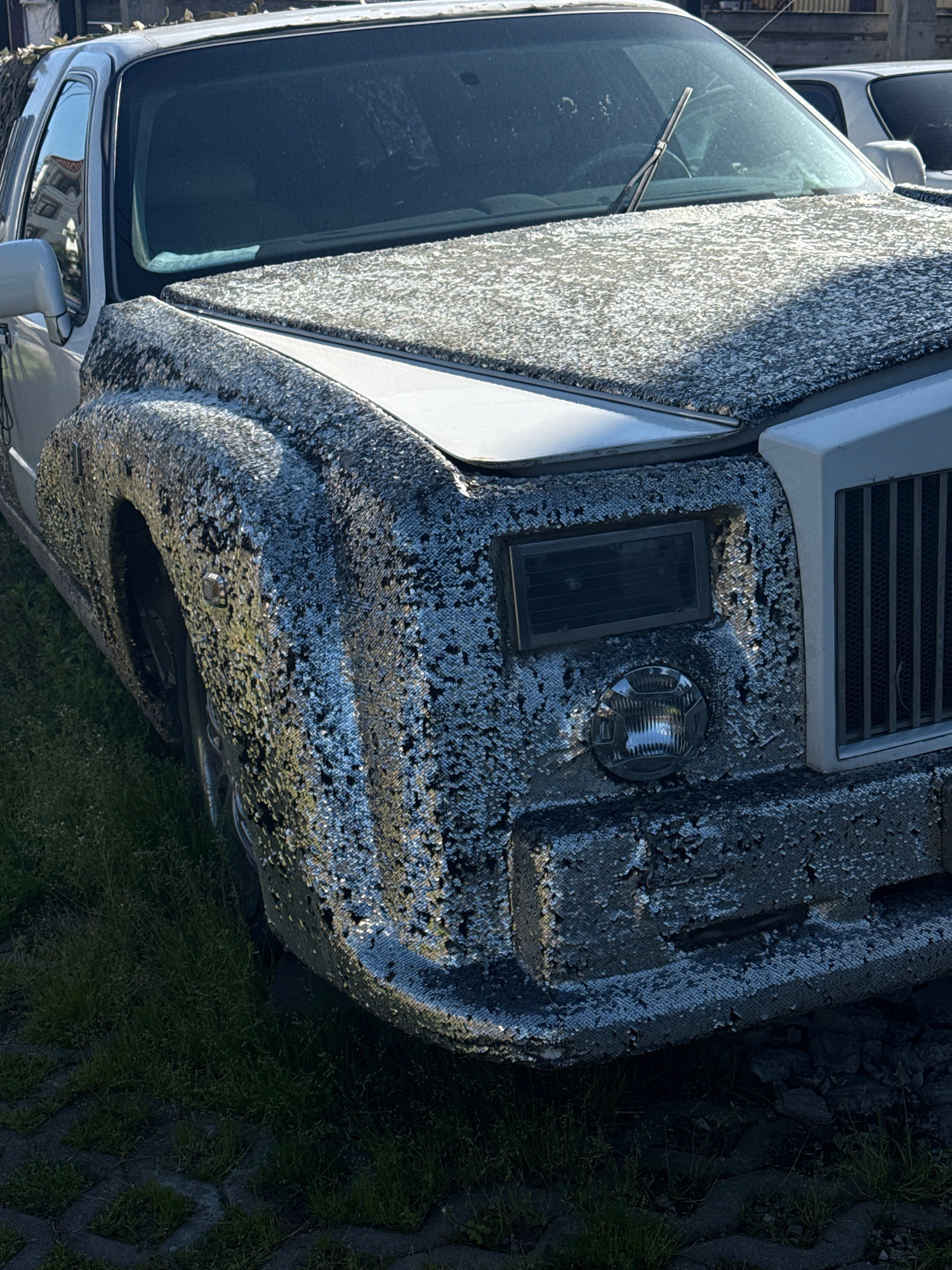 The image displays the front and side view of a car parked outdoors in Sochi, Russia, during bright daylight. The vehicle's most distinctive feature is its exterior, which is almost entirely covered i…read more
