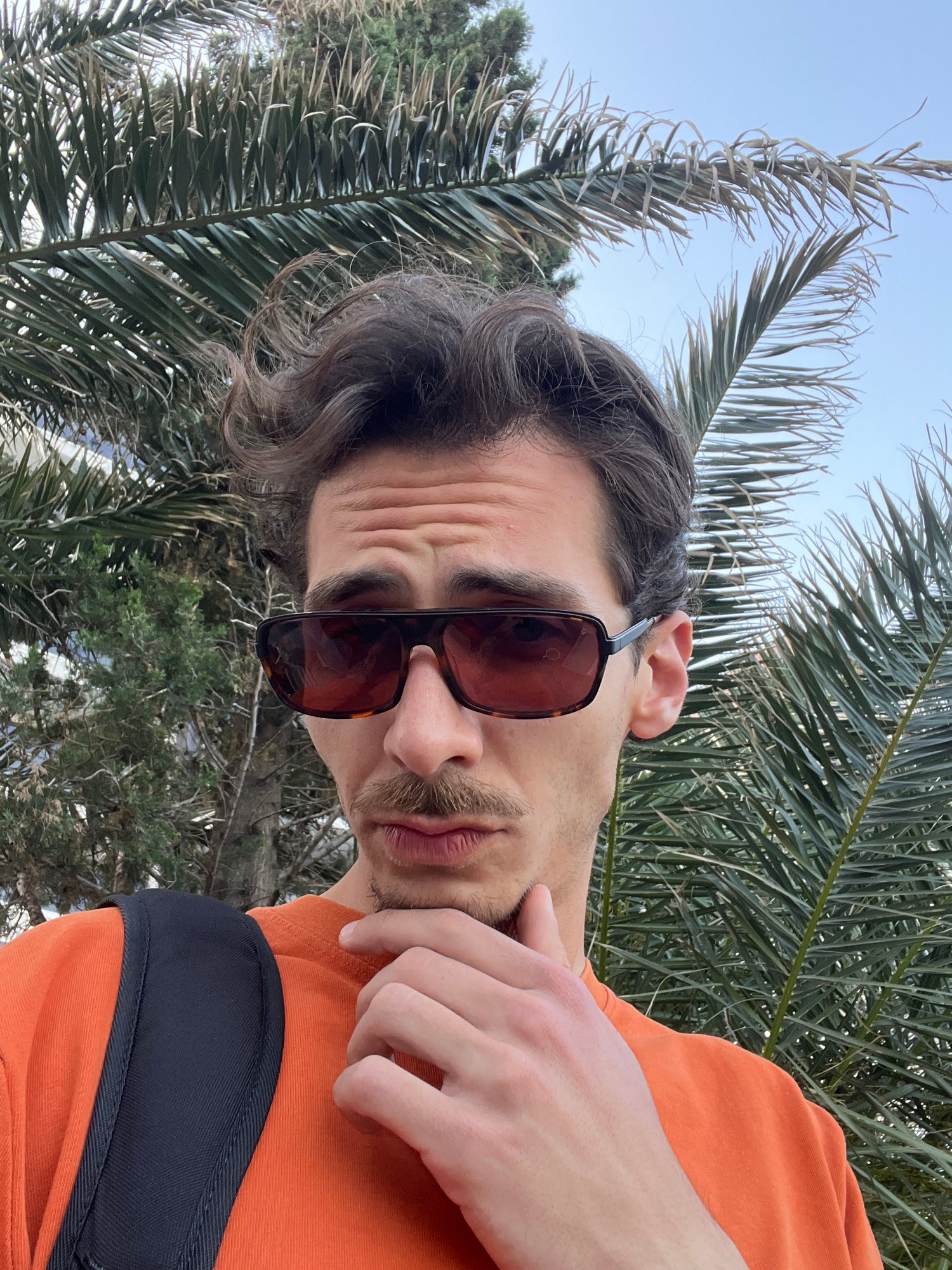 The image, originally captured in portrait orientation but presented rotated 90 degrees counter-clockwise, features a close-up outdoor portrait of a young adult man. He is looking directly at the came…read more