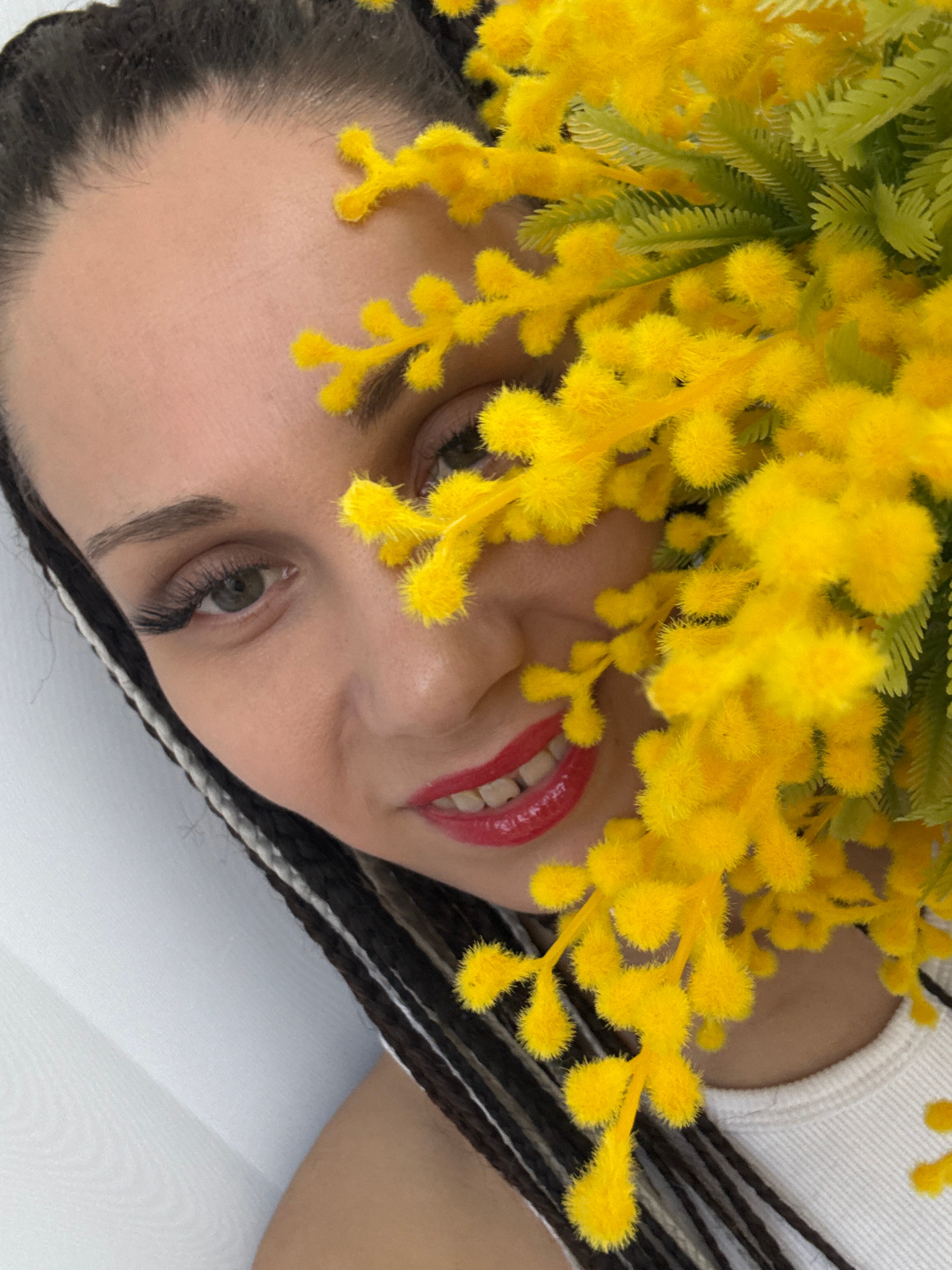 A close-up shot presents a person lying down, adorned with yellow mimosa flowers, with braided hair, against a white backdrop. The person has red lips and is wearing a white top.