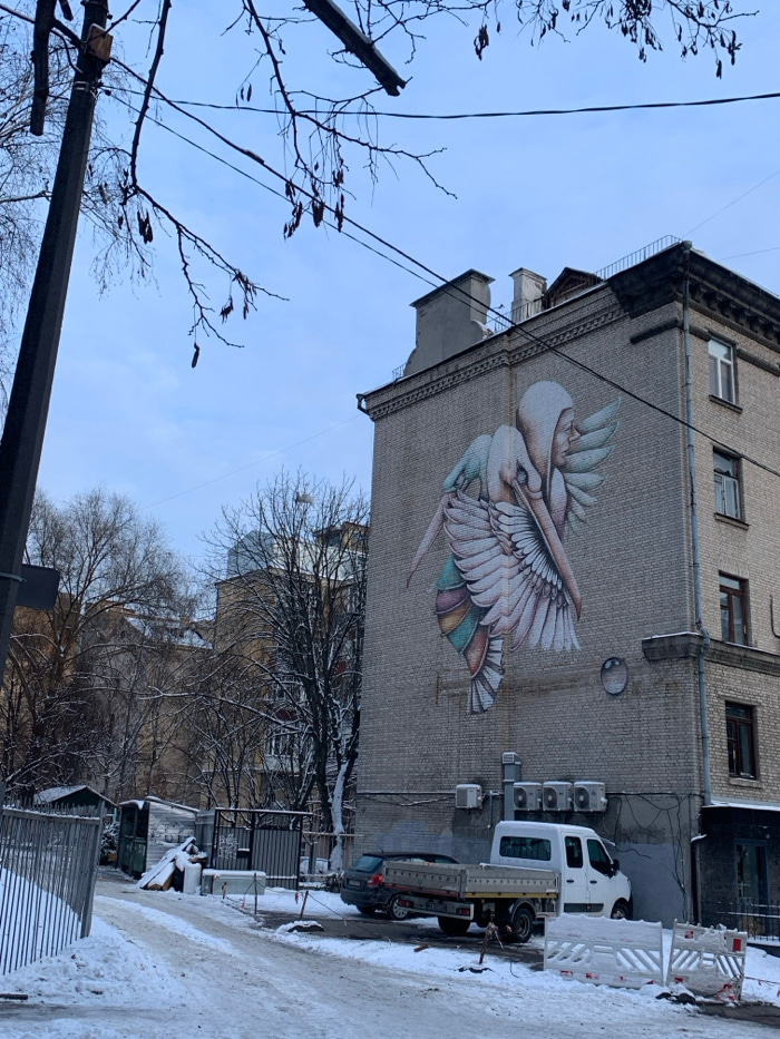 The image depicts a snow-covered urban alleyway in Kyiv, Ukraine, specifically at Sichovykh Striltsiv Street 31. The dominant feature is a large mural titled "Rebirth" by Fintan Magee, painted on the…read more