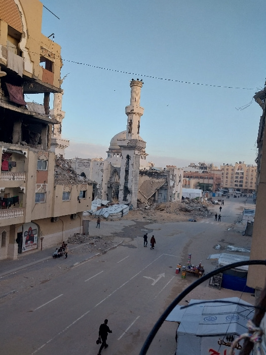 The image, oriented correctly, presents a wide-angle view of a heavily damaged urban landscape, likely after a conflict or disaster, taken from an elevated vantage point. The scene depicts a street fl…read more