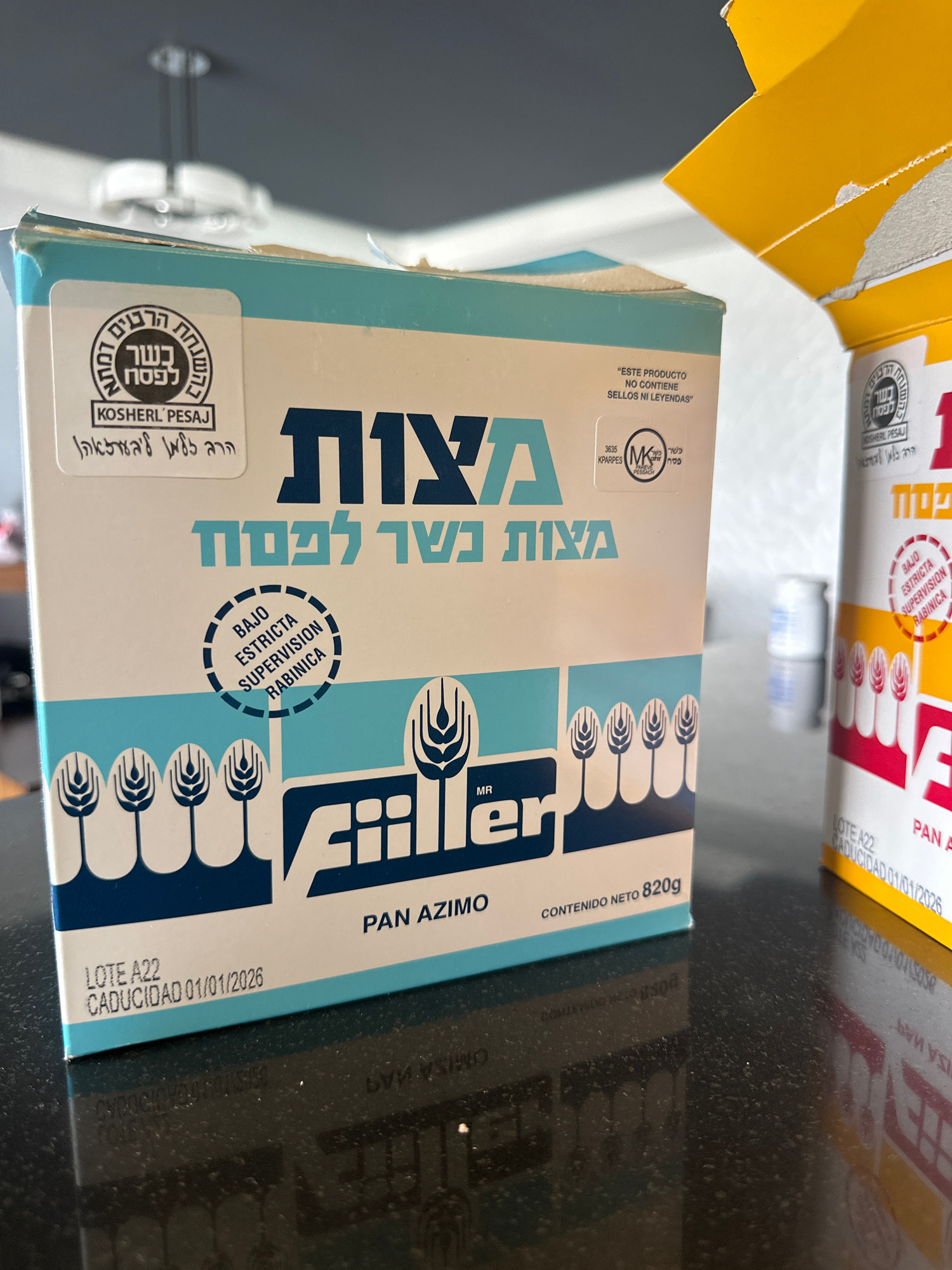 A close-up shot features a box of Filler Pan Azimo matzah on a dark surface, likely a countertop. The box has Hebrew and Spanish text, with symbols indicating it is Kosher for Passover. The expiration…read more