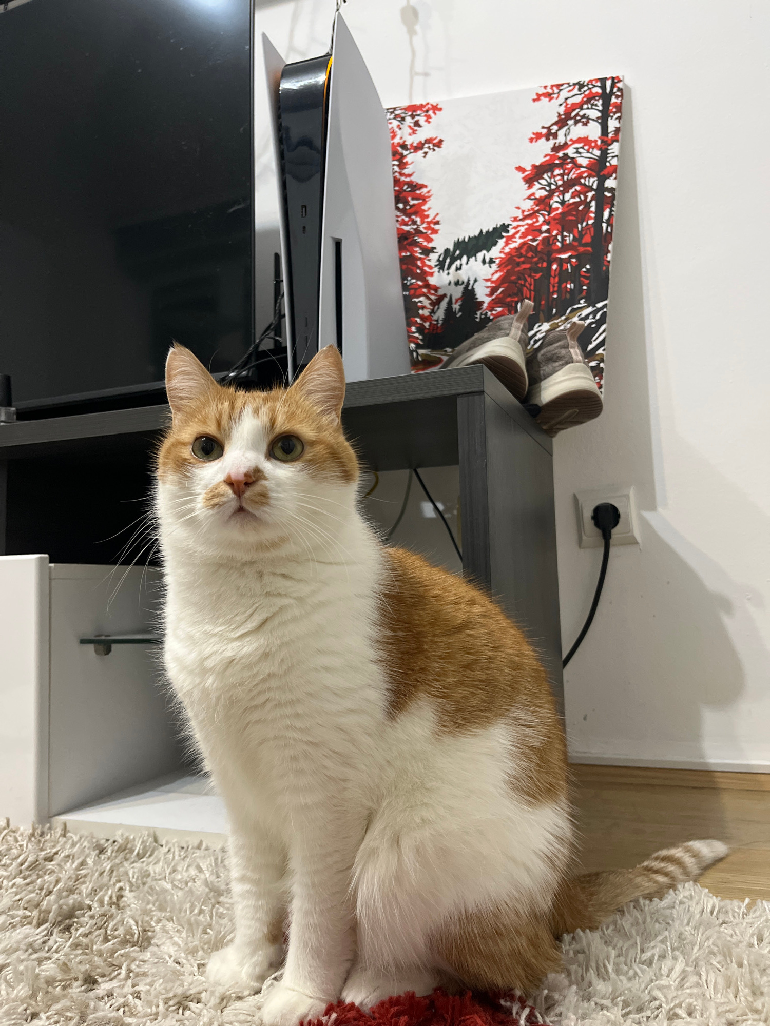 A medium-sized domestic short-haired cat, primarily white with orange patches, is positioned near a television and entertainment center. The cat is looking directly at the camera. The background incluβ¦read more