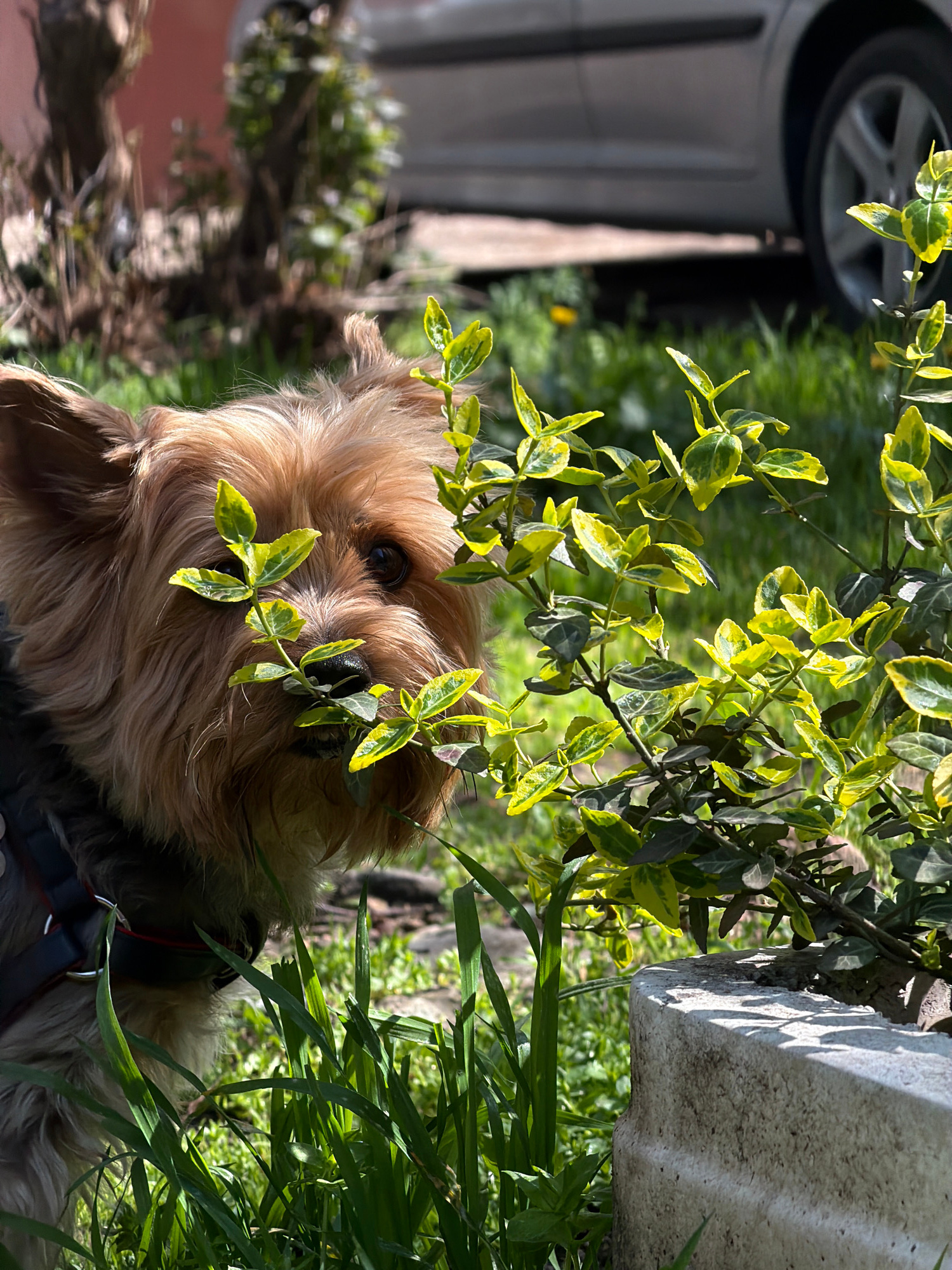 A medium, close-up shot shows a brown Yorkshire Terrier dog partially obscured by foliage, likely in a garden or park setting. The dog is facing the camera with its head slightly tilted. Green and yel…read more