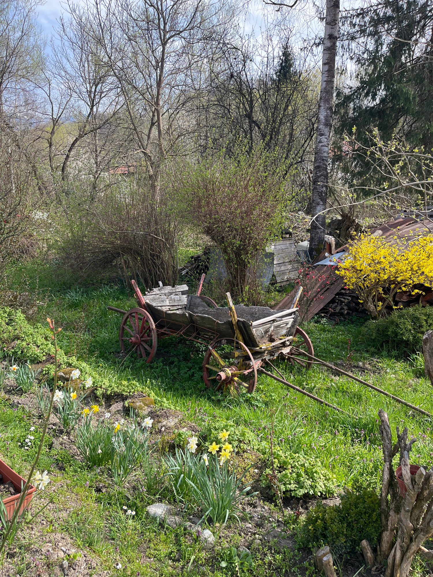 The image presents a rustic, overgrown garden scene in Apriltsi, Bulgaria. Dominating the midground is a dilapidated wooden cart with red-painted wheels, situated on a grassy slope. The cart shows sigβ¦read more