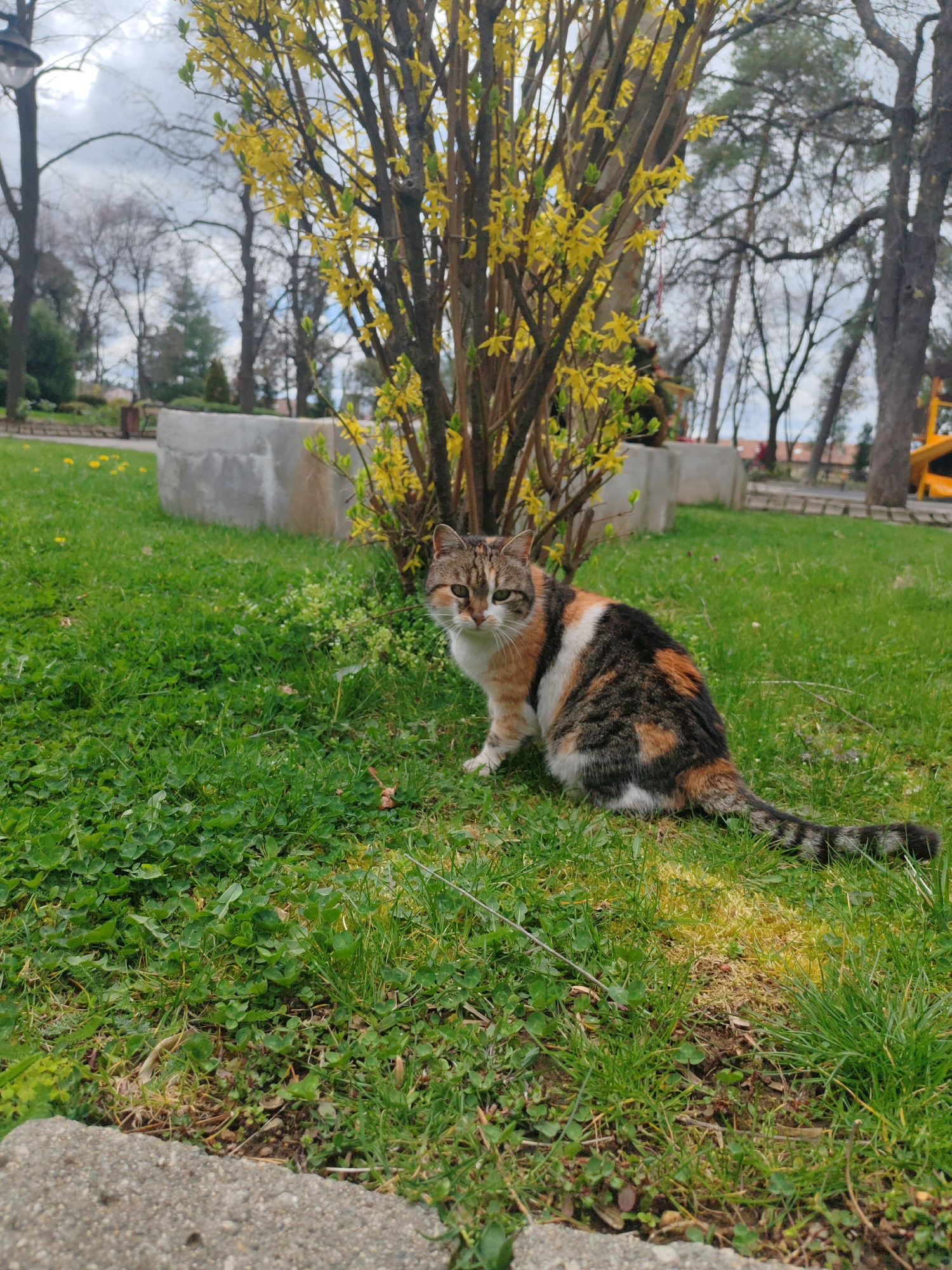 The image shows a calico cat sitting in a grassy area in a park. Behind the cat is a flowering bush with yellow blossoms. Further in the background are trees, concrete planters, and possibly a glimpseβ¦read more