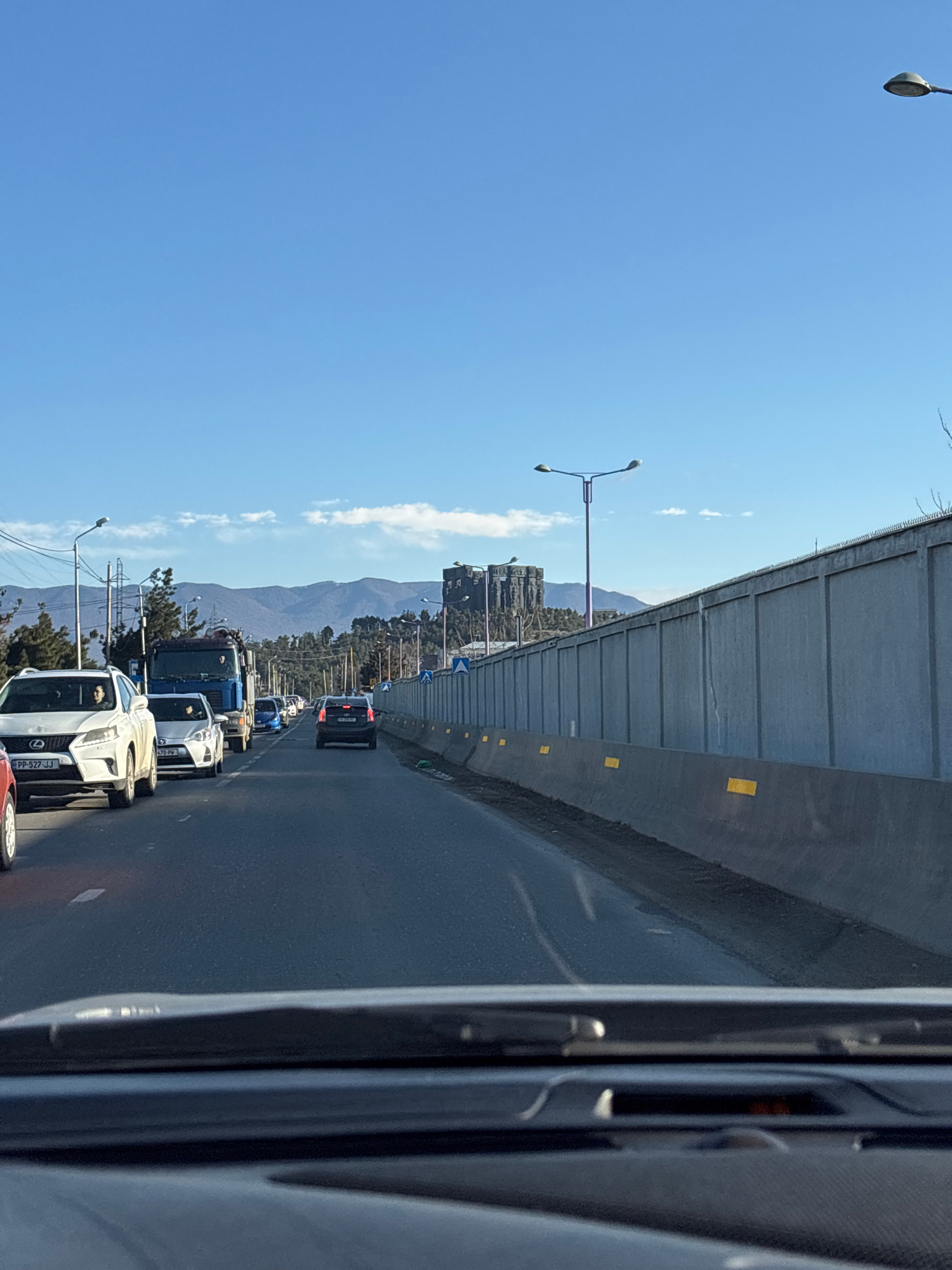 The image shows traffic on a road in Tbilisi, Georgia. The road is under an elevated highway or overpass. In the distance, there are mountains. Cars and a truck are visible in the traffic. The sky is…read more