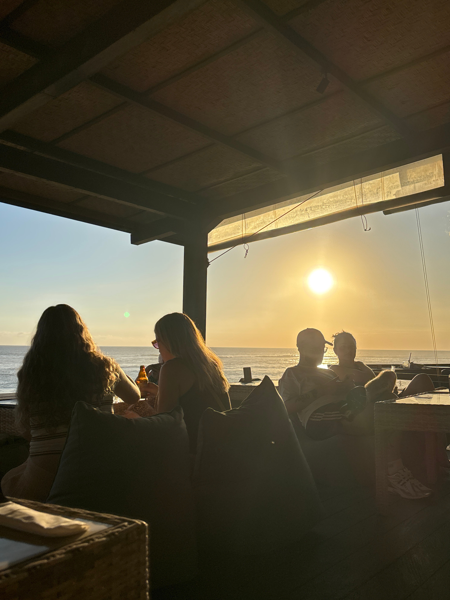 Captured in North Kuta, Indonesia, the photograph depicts a group of individuals gathered at what appears to be an outdoor lounge or bar area, likely positioned near the sea. The setting sun is visiblβ¦read more