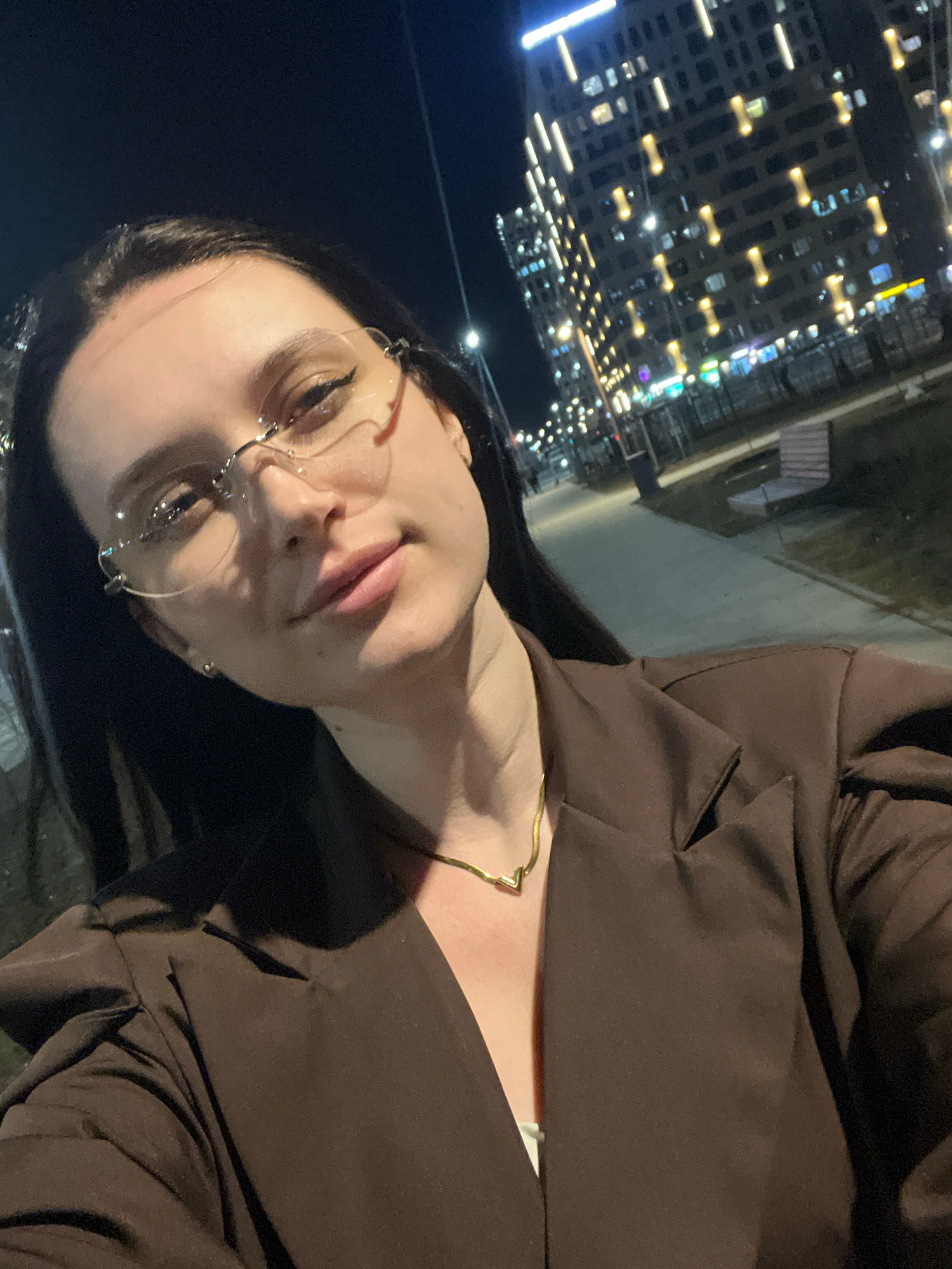 A medium, eye-level shot shows a woman wearing glasses and a brown jacket. She is wearing a gold necklace and has dark hair. The background features buildings and streetlights, suggestive of an urban…read more