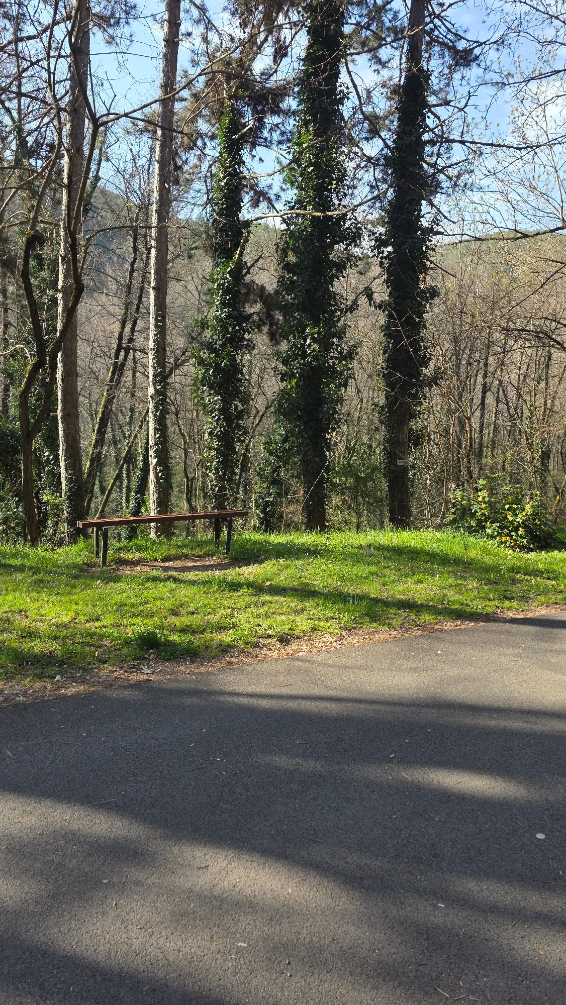 The image shows a roadside scene, likely in a park or wooded area. A narrow asphalt road occupies the right side of the image, with dappled shadows cast across it. To the left of the road is a strip o…read more