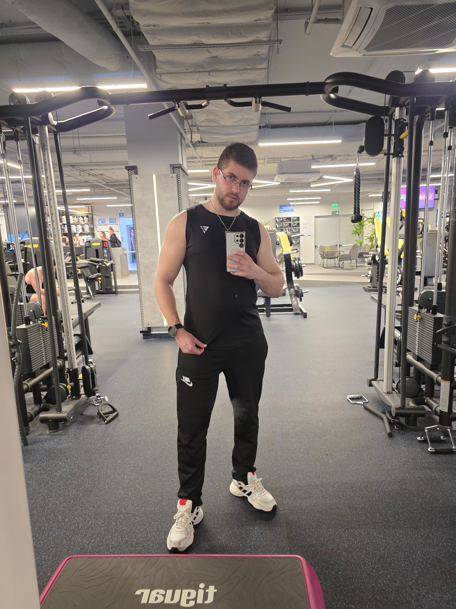 A man in a black tank top and black Nike sweatpants is standing in a gym. He is holding a phone and taking a selfie. He is wearing glasses and a watch. The gym has exercise machines and equipment. Theβ¦read more
