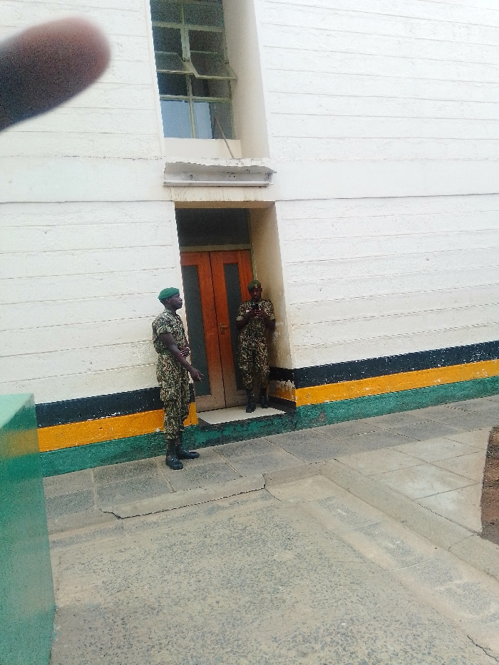 The image displays two uniformed males standing outside a building in what appears to be a government or security facility in Nairobi, Kenya. This identification is supported by the distinct horizonta…read more