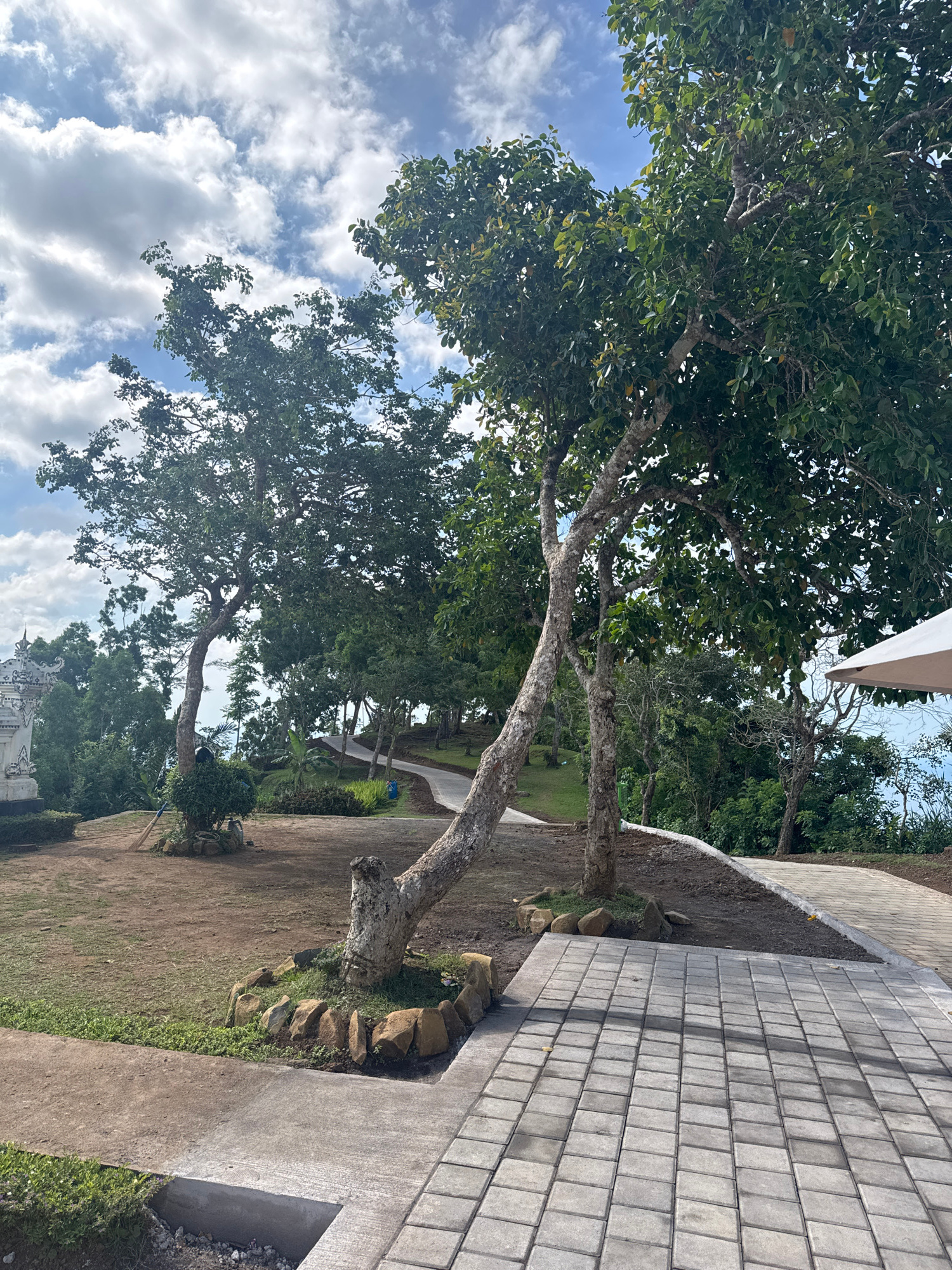 The image depicts a tree-lined area in Abang, Indonesia. A paved walkway, composed of rectangular blocks, runs along the upper right of the frame. The path is bordered by a raised concrete curb. Below…read more