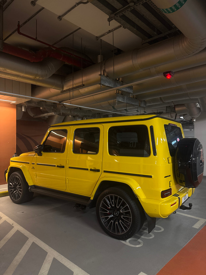 A bright yellow Mercedes-Benz G-Wagen (G-Class SUV) is stationary, parked diagonally in a designated bay within a modern, indoor parking garage. The vehicle features black multi-spoke alloy wheels wit…read more