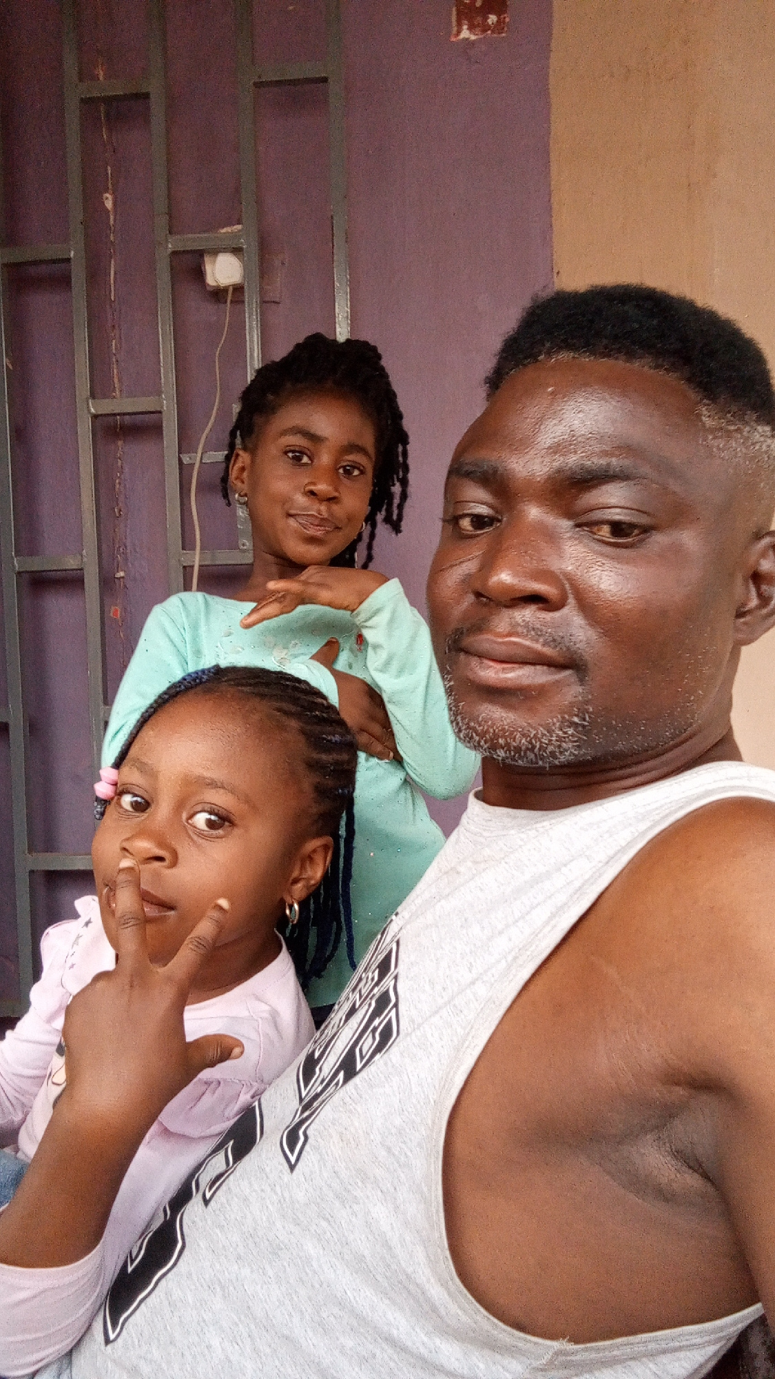 The photograph shows three people. A man is in the foreground, partially visible, wearing a white sleeveless shirt. Behind him and to his left are two young girls. The girl in the front wears a pink l…read more