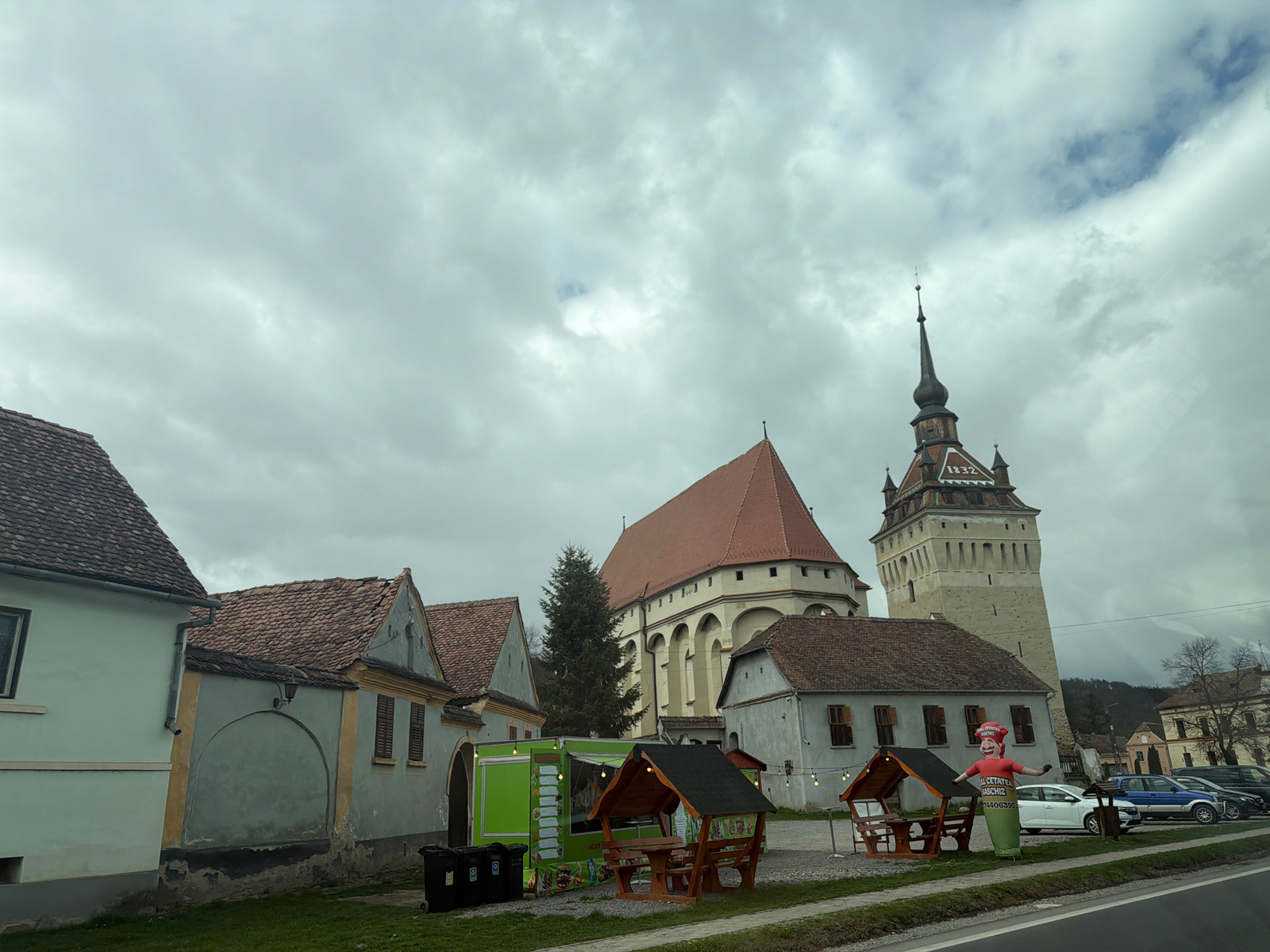 The image shows a view in Saschiz, Romania, featuring a cluster of buildings against a cloudy sky. A building with a tall, pointed tower stands out, with a roof that has the number 1832 on it. Next to…read more