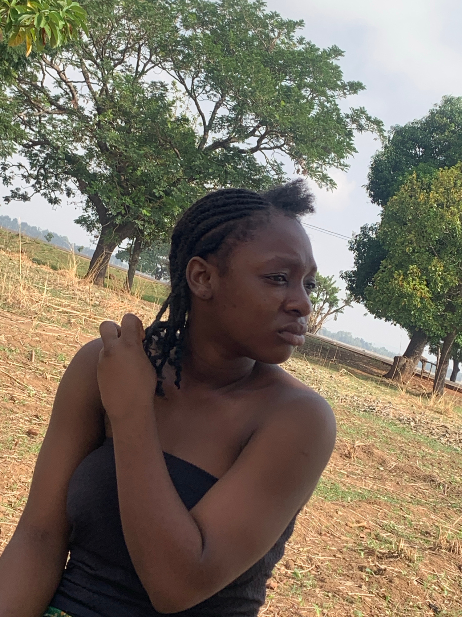 A young woman with dark skin and black braided hair, styled partially up, is the central subject of this outdoor, eye-level shot. She is wearing a dark, strapless top and is depicted in a three-quarte…read more