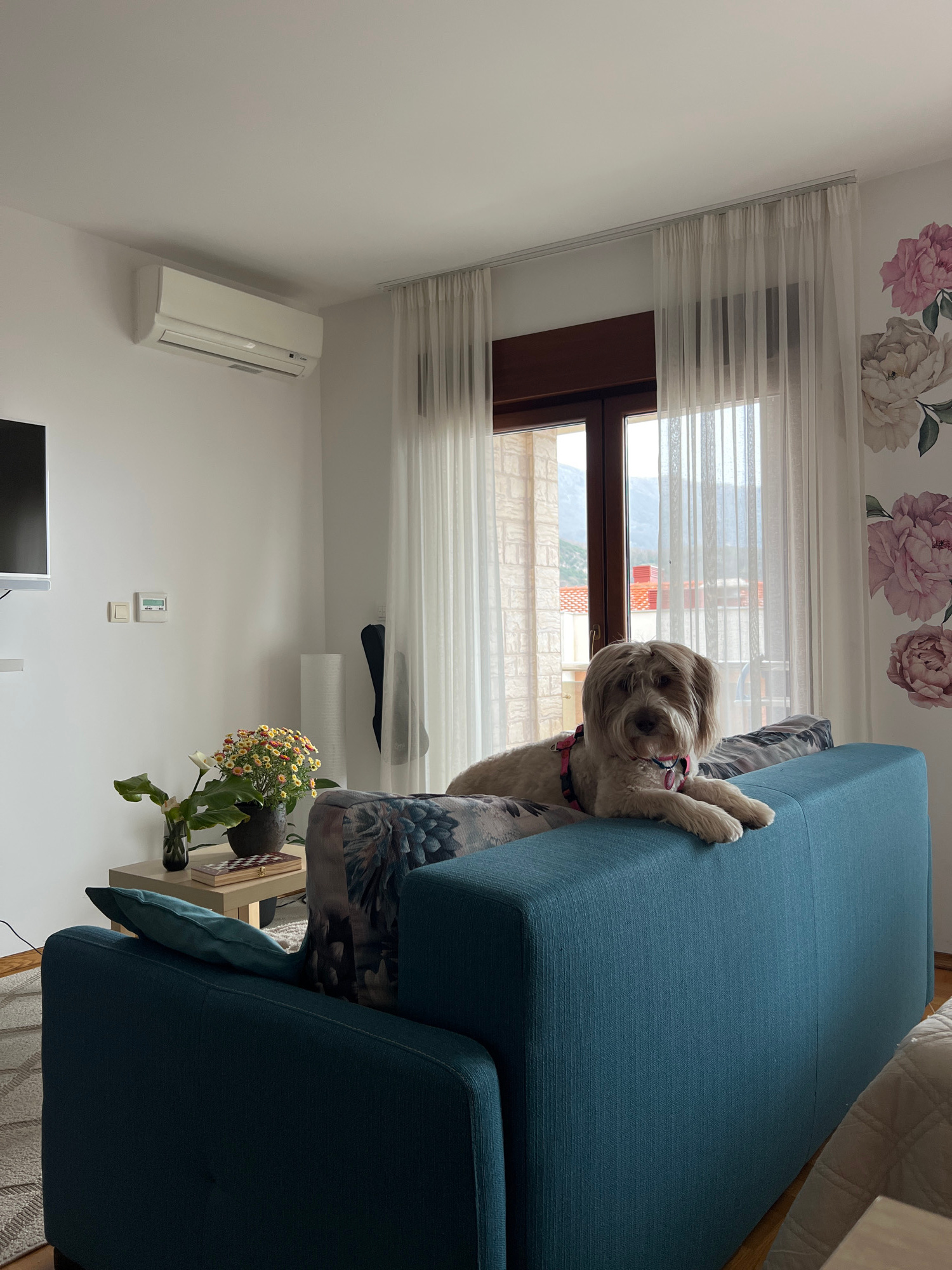 The image is an interior shot of a room, likely in Boreti, Montenegro, judging by the view visible through the window. The focal point is a light-brown dog, possibly a Lhasa Apso, sitting on a teal so…read more