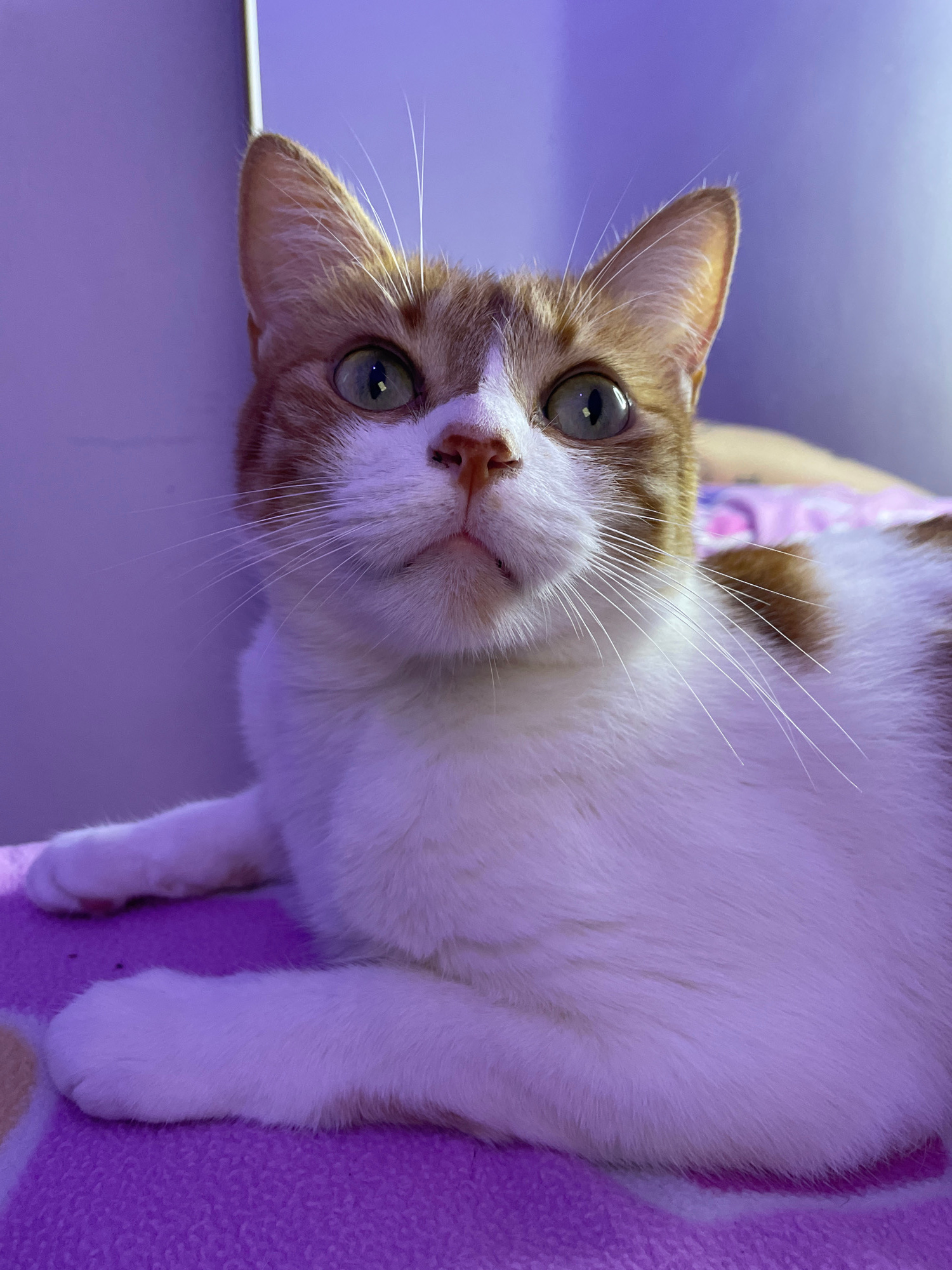 A medium shot depicts a cat lying on its side, staring directly at the camera. The cat is predominantly white with patches of orange tabby markings on its head and ears. It has green eyes and numerous…read more