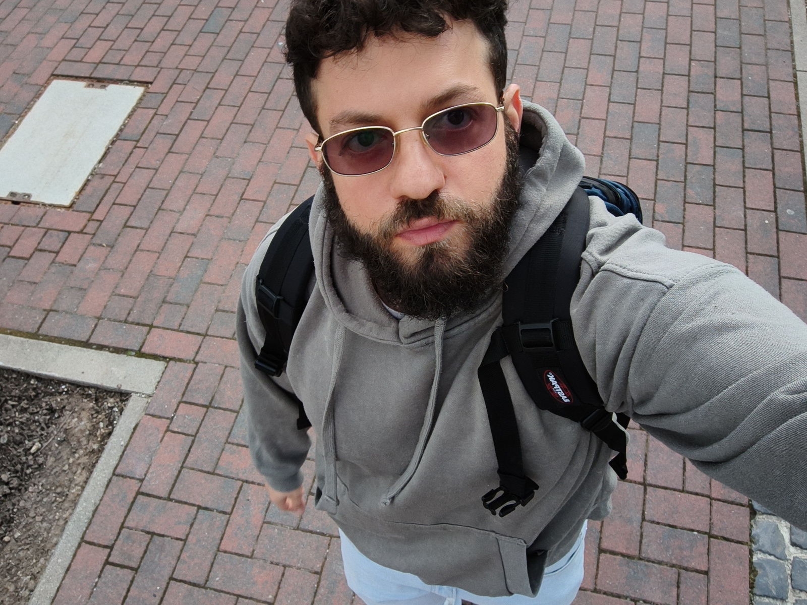A man with curly dark hair, a full dark beard, and sunglasses is taking a selfie while standing on a brick sidewalk. He is wearing a gray hoodie and a backpack. The sidewalk is made of red bricks with…read more