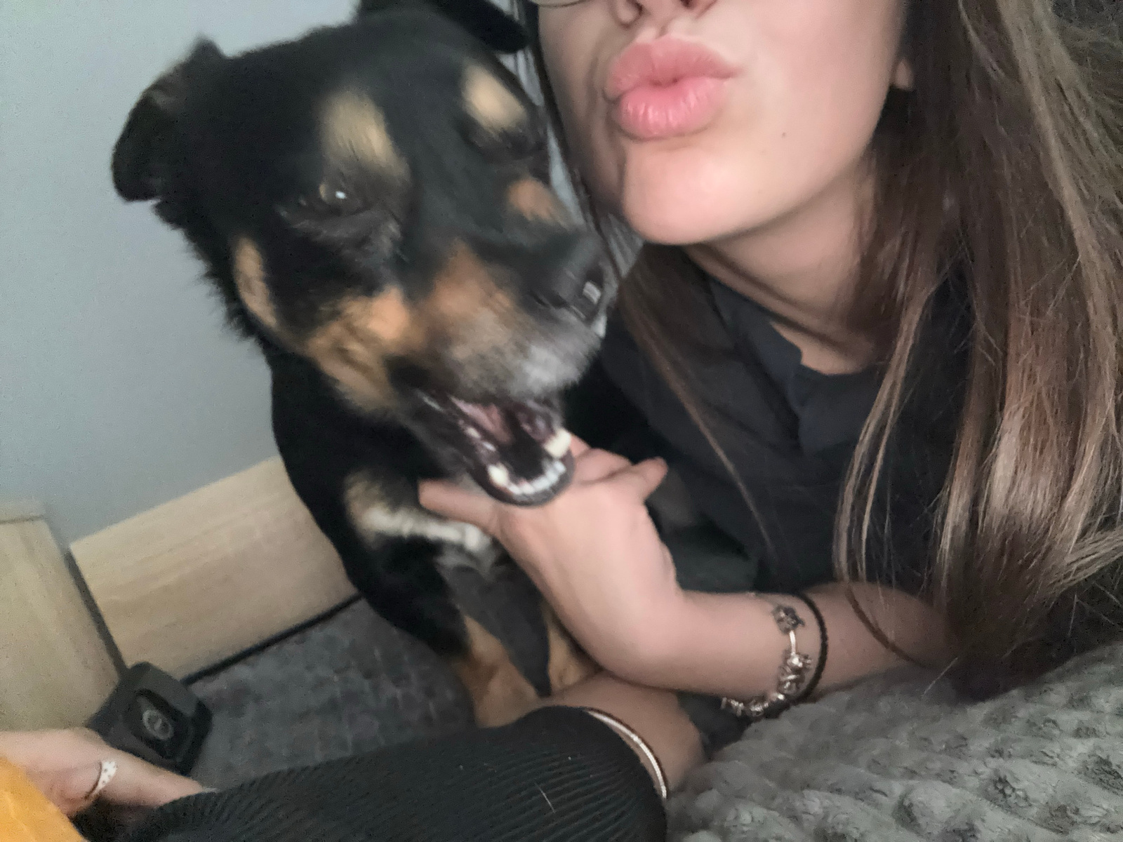 A woman is indoors with a black and tan dog. The woman has dark hair and is wearing bracelets. She is making a kissing face. The dog has its mouth open, possibly vocalizing or panting. The background…read more