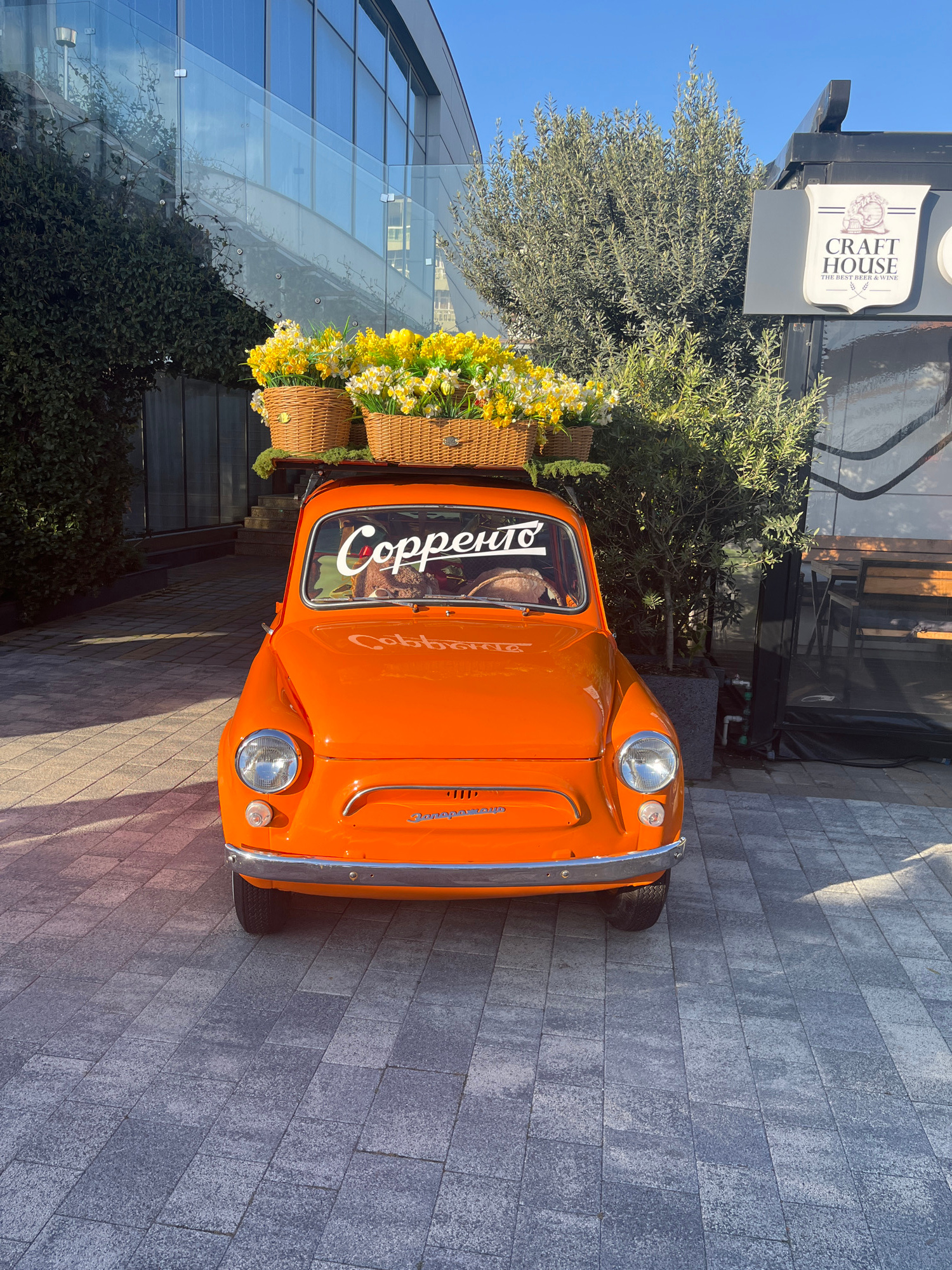 An eye-level, medium shot shows an orange vintage car parked on a paved surface. The car has flower-filled baskets attached to its roof. The name "Copperpen" is written vertically on the windshield. T…read more