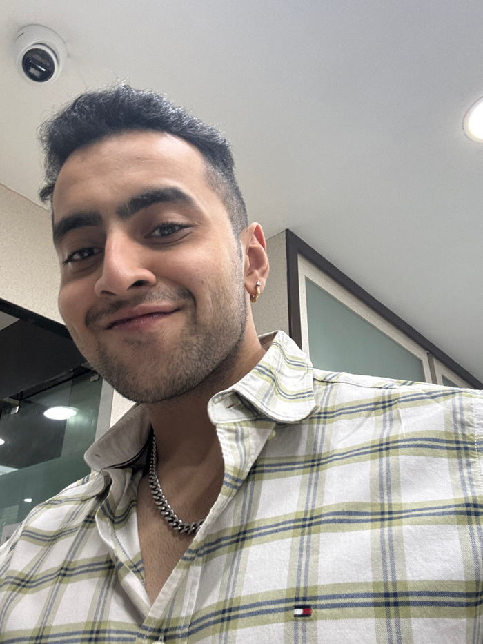 A man smiles subtly at the camera. He has dark hair, brown eyes, and stubble. He is wearing a white and light green plaid shirt. A silver chain necklace is visible around his neck. In the background,…read more