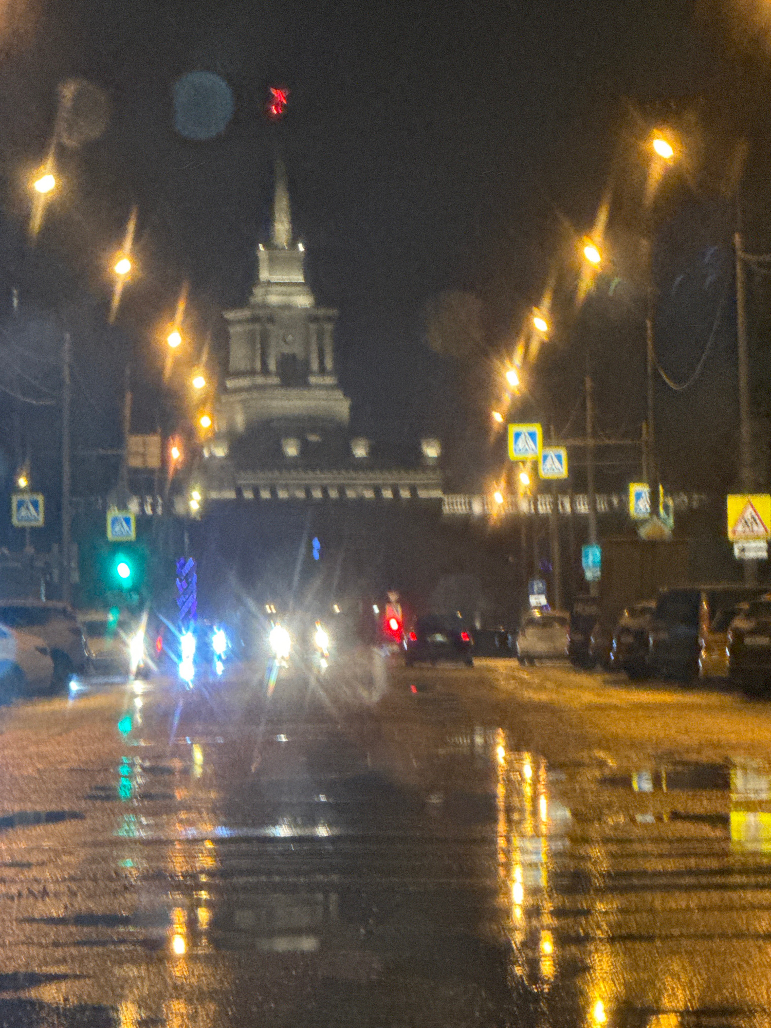The image depicts a nighttime view of Krasnoyarsk, Russia, captured through a wet window. The focus is on the city skyline, featuring the Saint Pokrovsky Cathedral, illuminated streetlights, and traff…read more