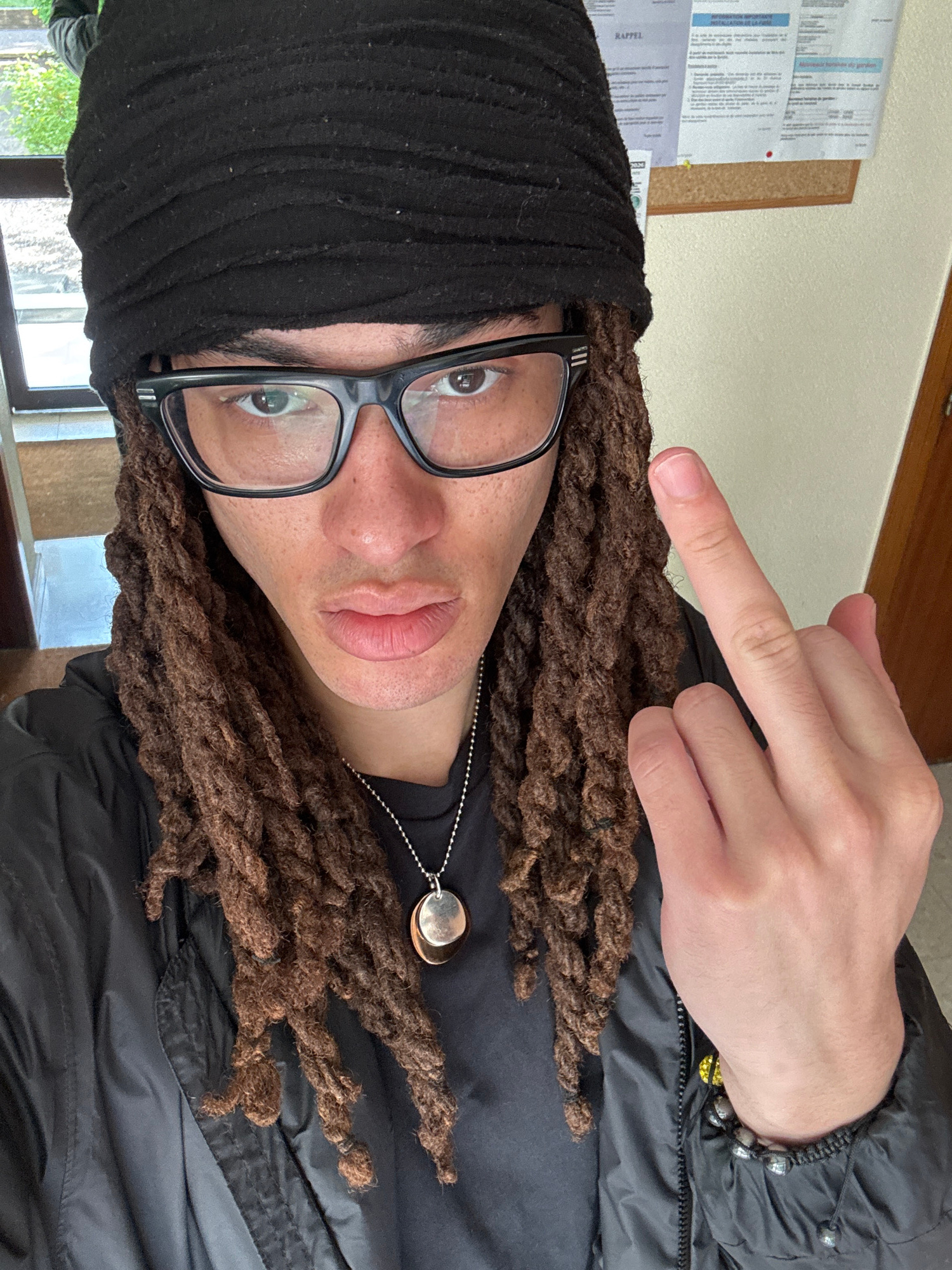 An upright, close-up, eye-level shot captures a person, likely in an indoor setting, making a defiant gesture. The subject's head is tilted slightly, and they are looking directly towards the viewer.…read more