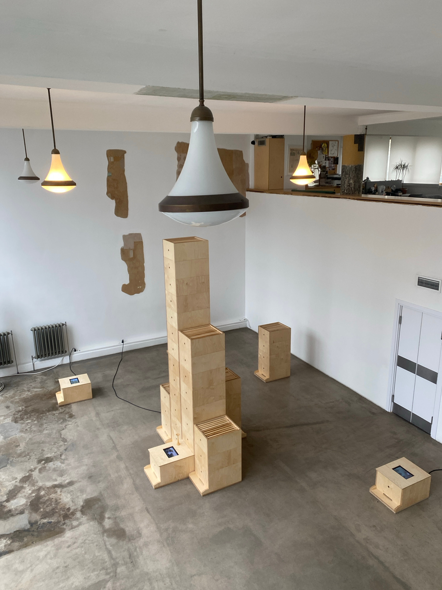 The image depicts the interior of an art gallery or exhibition space, likely in Moscow, Russia. The room has white walls with patches of exposed brick or plaster, suggesting a historical building. Sev…read more