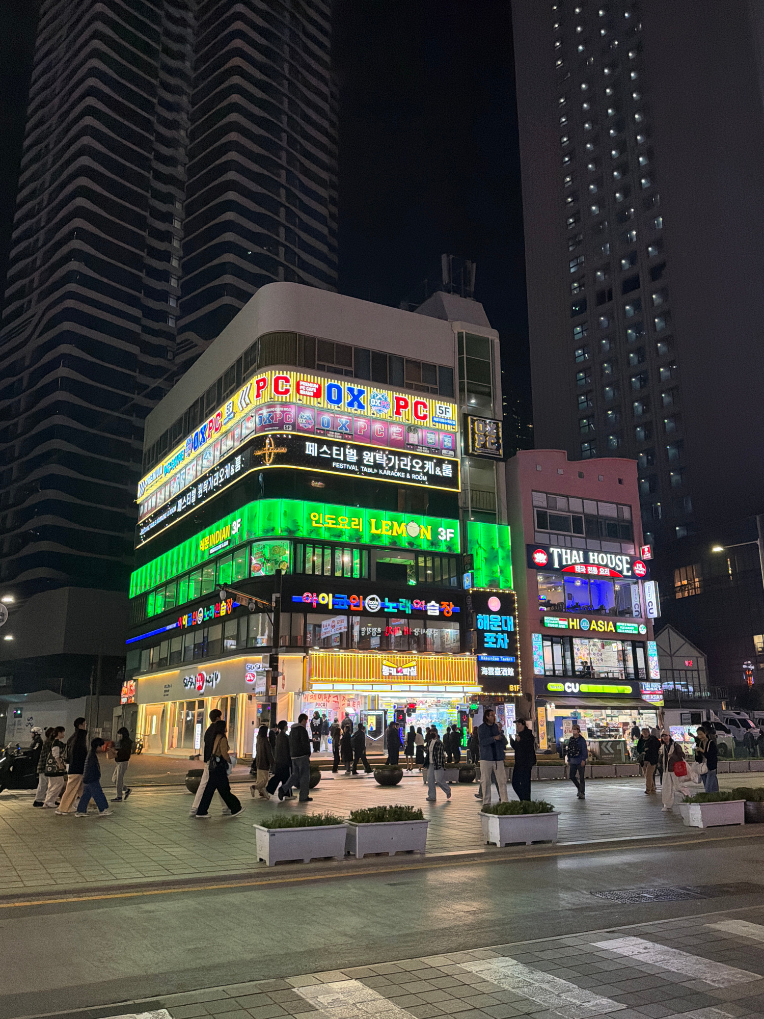 This image showcases a lively street scene at night in Busan, South Korea. Several multi-story buildings are illuminated with bright, colorful signs in both Korean and English, advertising various bus…read more