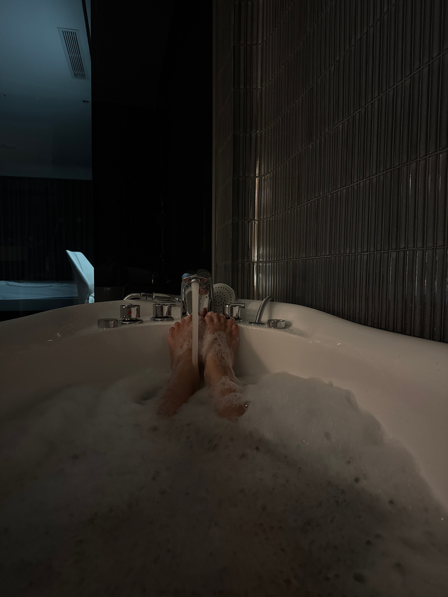 Here is a detailed description of the image: A sideways view of a bubble bath with a person's feet visible among the suds. The tub is white and appears to be a modern design. The bathtub faucet is on…read more