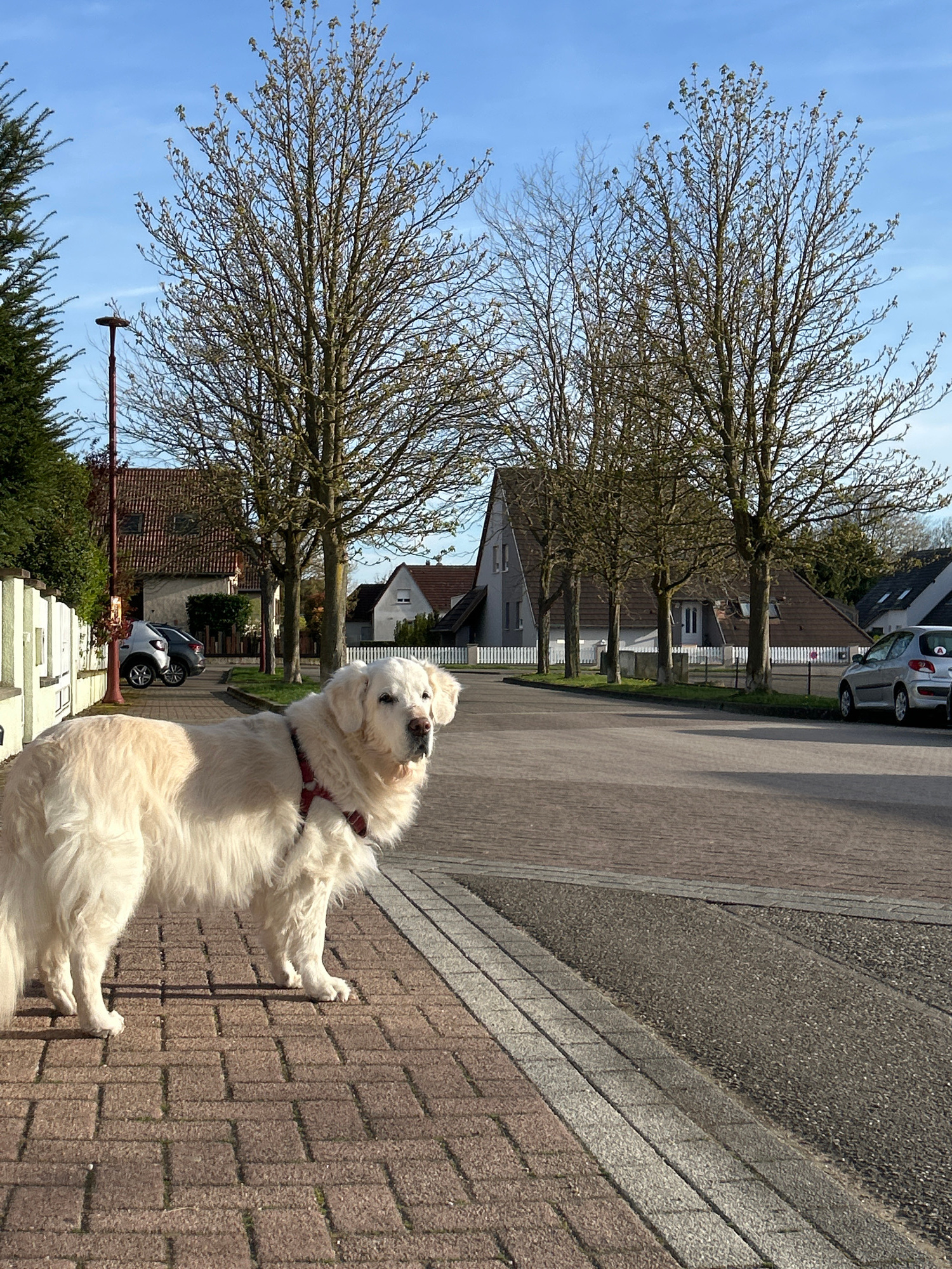 A white, medium-sized dog is standing on a brick sidewalk next to a street in Truchtersheim, France. The dog is wearing a red harness and looking upwards and slightly to the left. A row of trees lines…read more