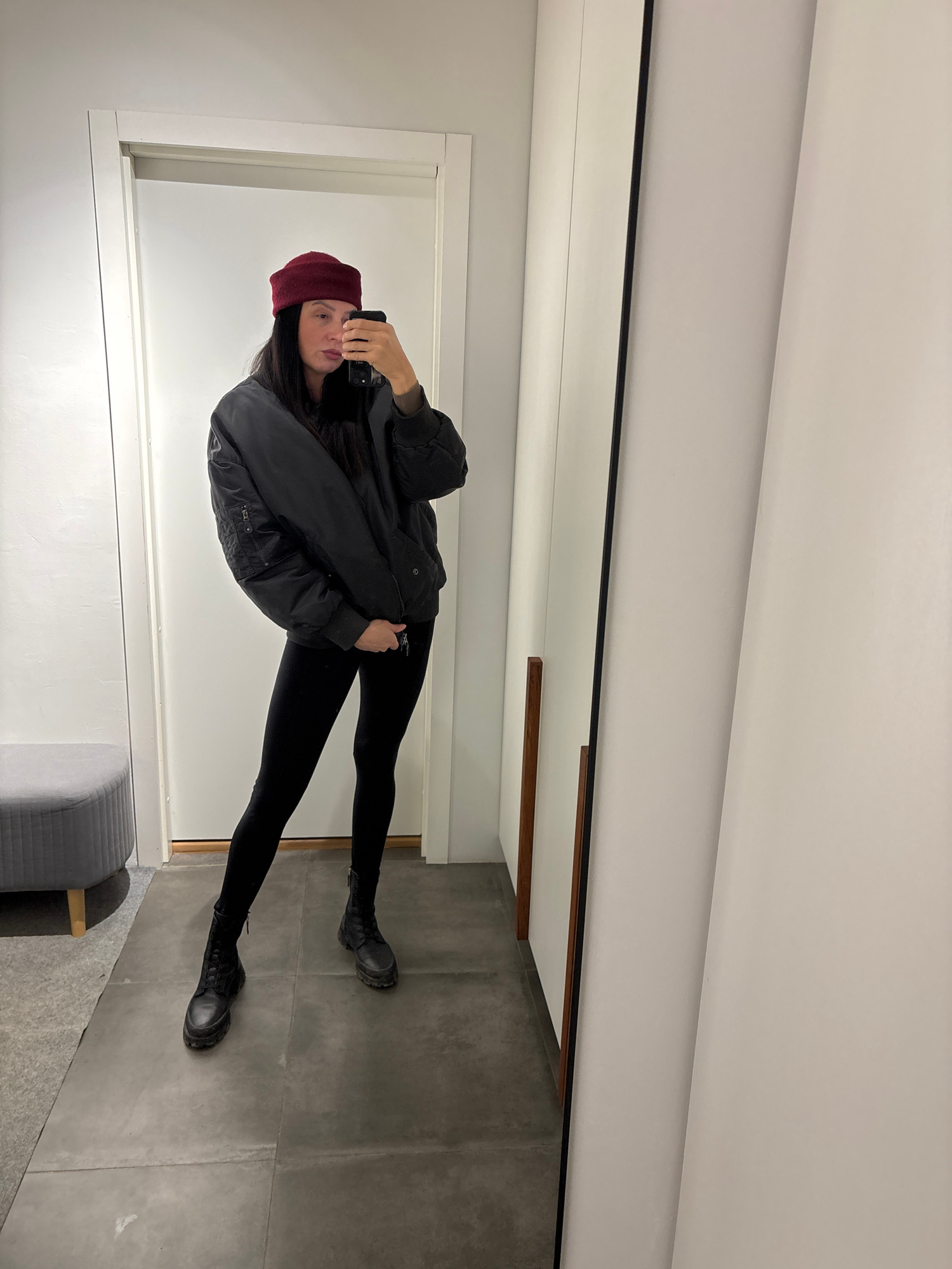 A person in a mirror selfie is positioned in front of a white wall. The person has dark hair, is wearing a dark bomber jacket, black pants, black boots and a burgundy beanie. The floor is grey tile. A…read more