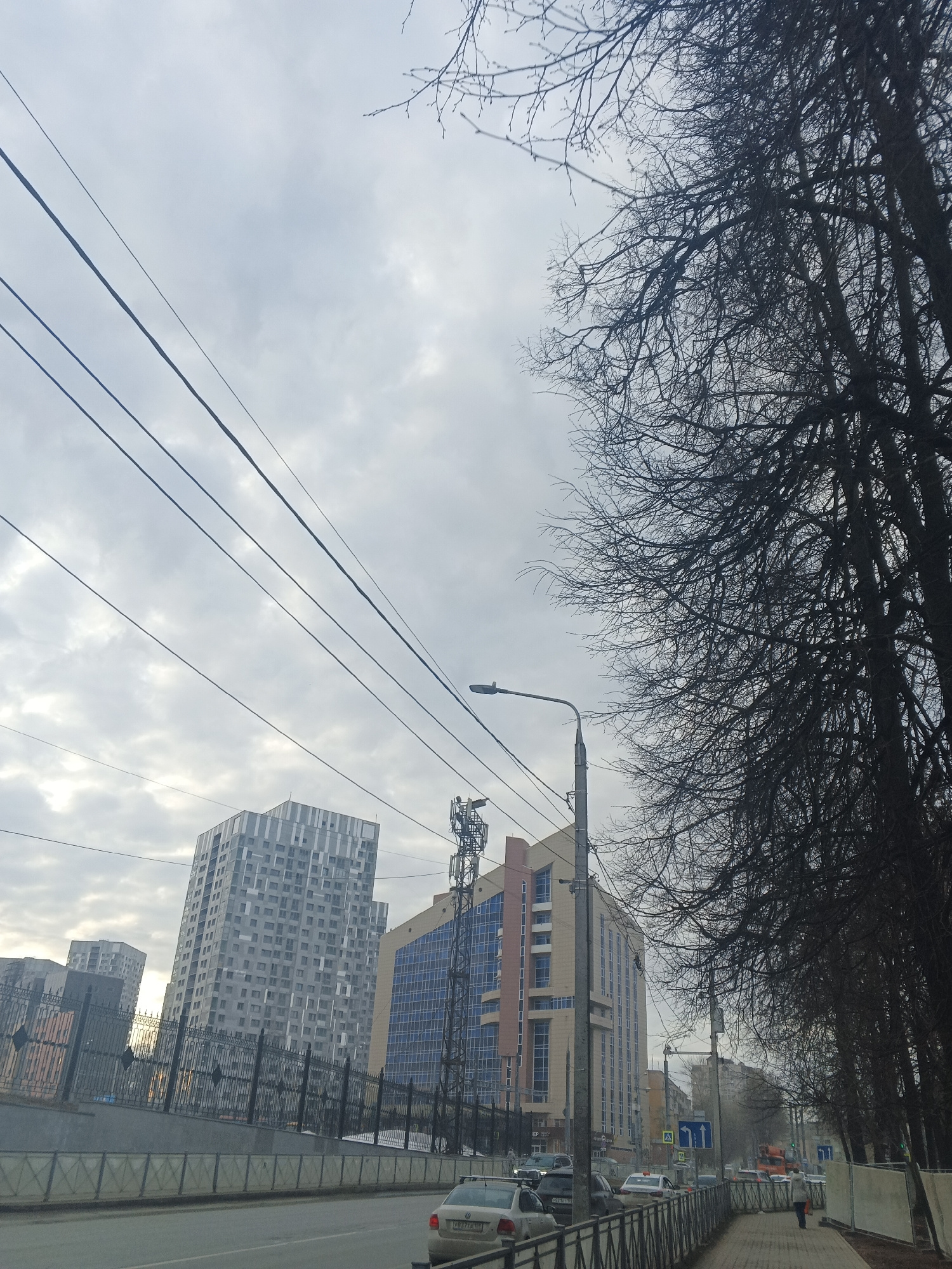 The image depicts a street scene in Perm, Russia on an overcast day. In the foreground, a grey car is visible, with a metal fence separating the road from the sidewalk. A few other cars can be seen fu…read more