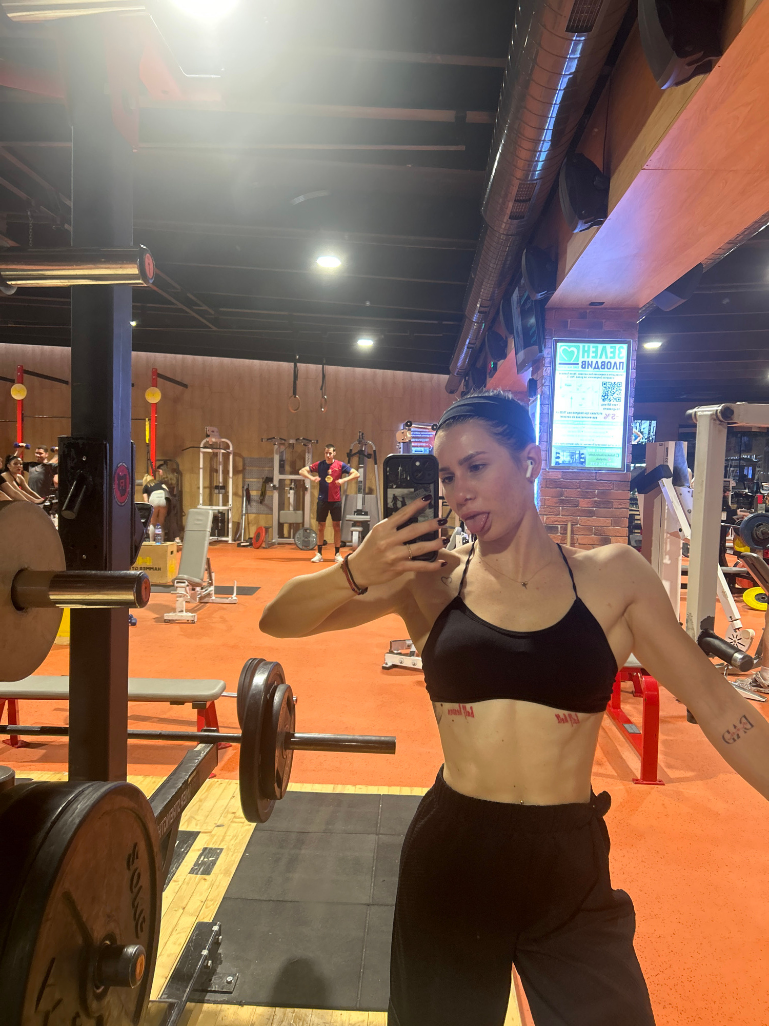The image shows a woman in a black sports bra and black pants taking a selfie in a gym. The gym equipment includes weight plates, a squat rack, and other machines. In the background, there are other p…read more