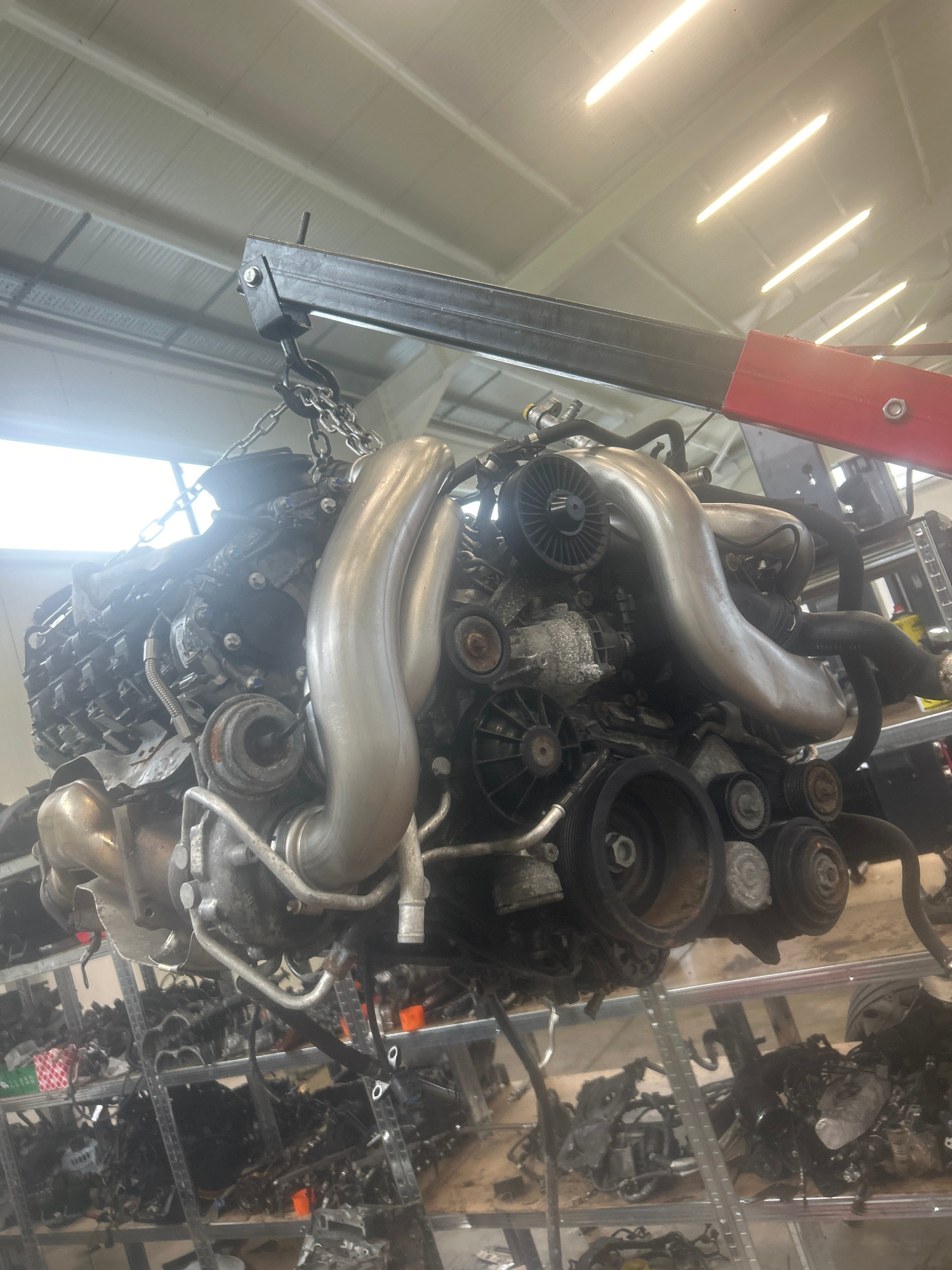 The image shows an engine suspended by a chain from a red and black engine hoist. The engine is dirty and covered in various hoses, belts, and pulleys. In the background, a metal rack system holds var…read more
