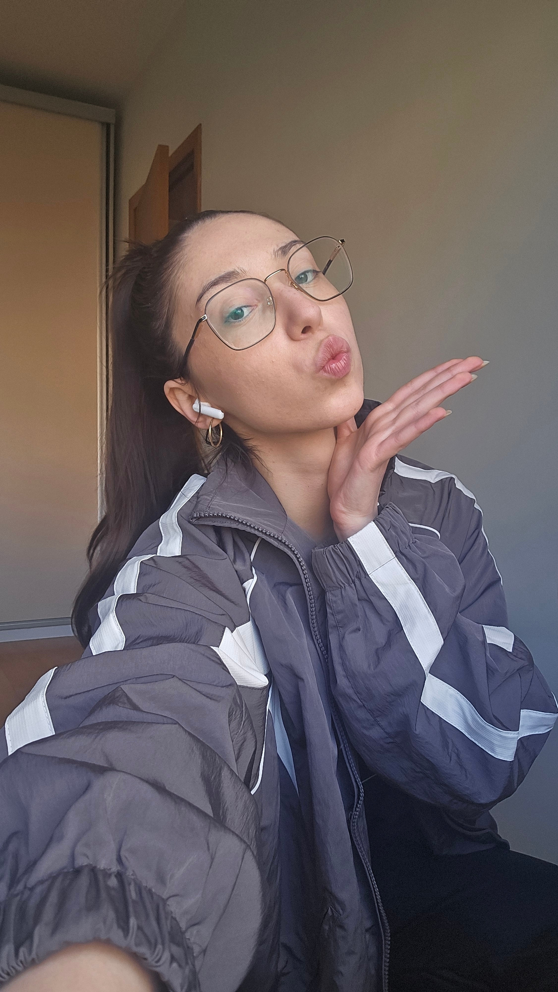 A young woman is oriented at an angle to the right. She is wearing glasses and has earbuds in her ears. She is wearing a gray jacket with white stripes. Her hand is held up near her face, and she is p…read more